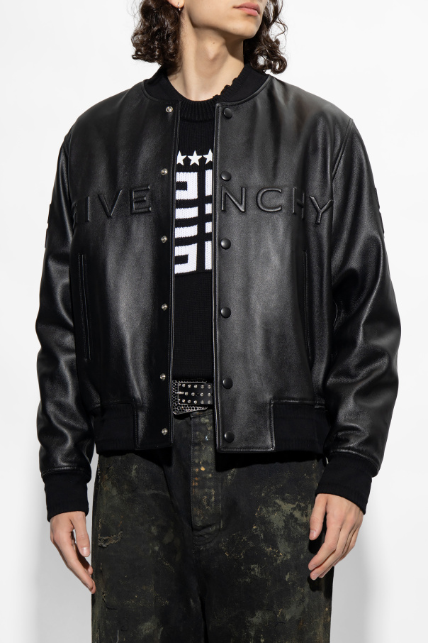 Black bomber jacket from Givenchy. Crafted from lamb leather, this style showcases an embossed logo, two slip pockets and ribbing on the standing collar, bottom hem and cuffs.