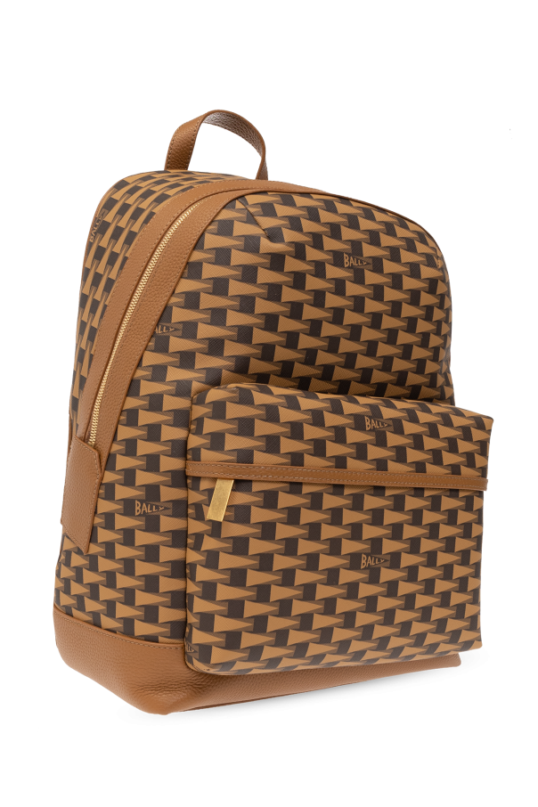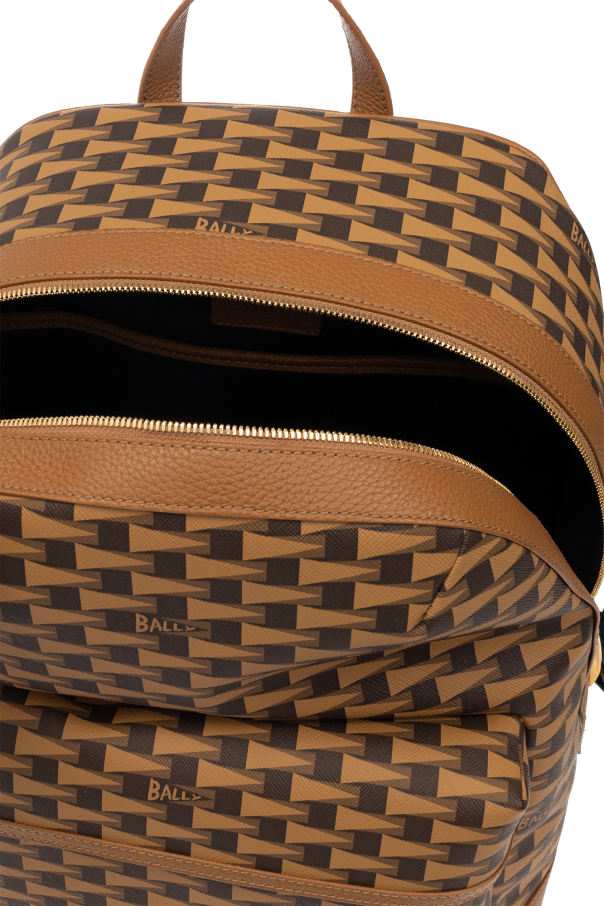 Brown and black backpack from Bally. Made of coated canvas and leather, this design fastens with a two-way zip and showcases a logo pattern, adjustable shoulder straps, a short handle, gold-tone metal hardware and one internal compartment with four slip pockets and one zip pocket.