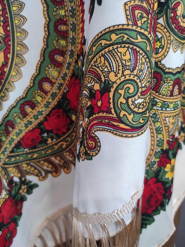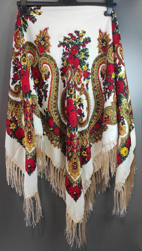 Украинский национальный платок насыщенного кремового цвета с красными розами и шелковой бахромой.Размер платки позволяет носить его на плечах, вокруг шеи или завязать красиво на голове, что разнообразит повседневную одежду. Красивым платком можно украсить любое пальто.Такий аксессуар дополнит Ваш образ на Рождество, Пасхи, Масляный, День украинского платка, День вышиванки, или завершит сценический украинский наряд. Может стать отличным вариантом при выборе сувениров на подарок.