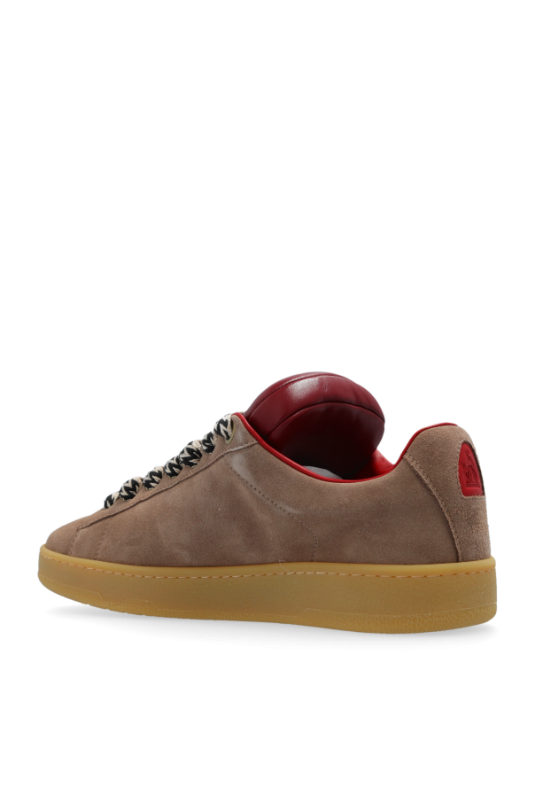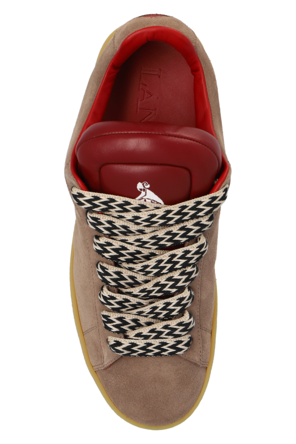 Brown and red ‘Curb’ sneakers from Lanvin x The Future, the ‘The LANVIN LAB by FUTURE’ collection. Made of suede and leather with fabric trims, this lace-up pair sits on a beige rubber sole and features an embossed and embroidered logo, perforations on the front as well as decorative, wide shoelaces with a geometric motif and multicolored pins.