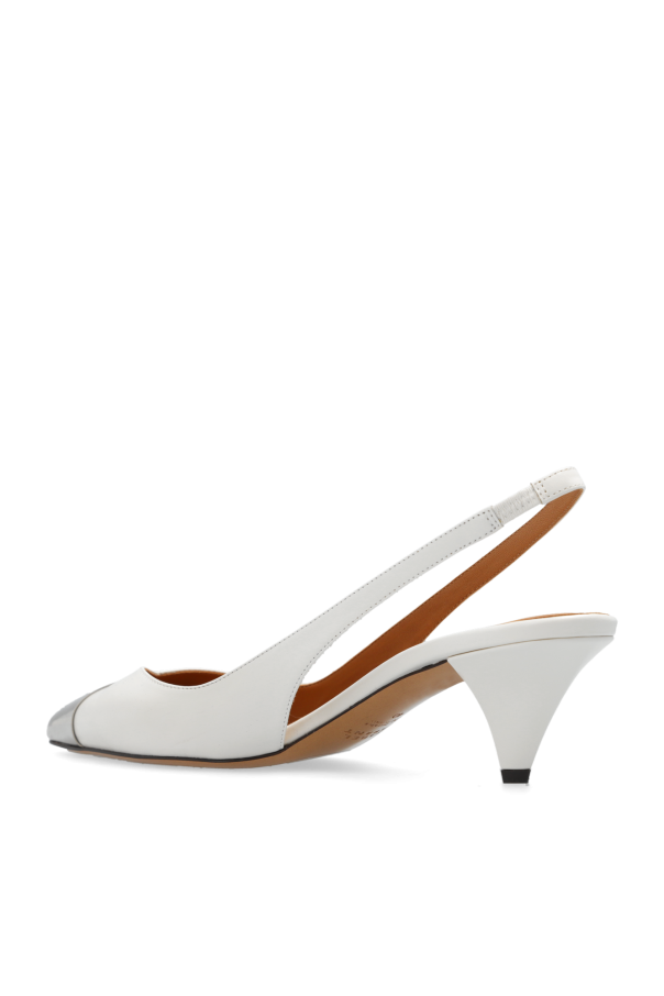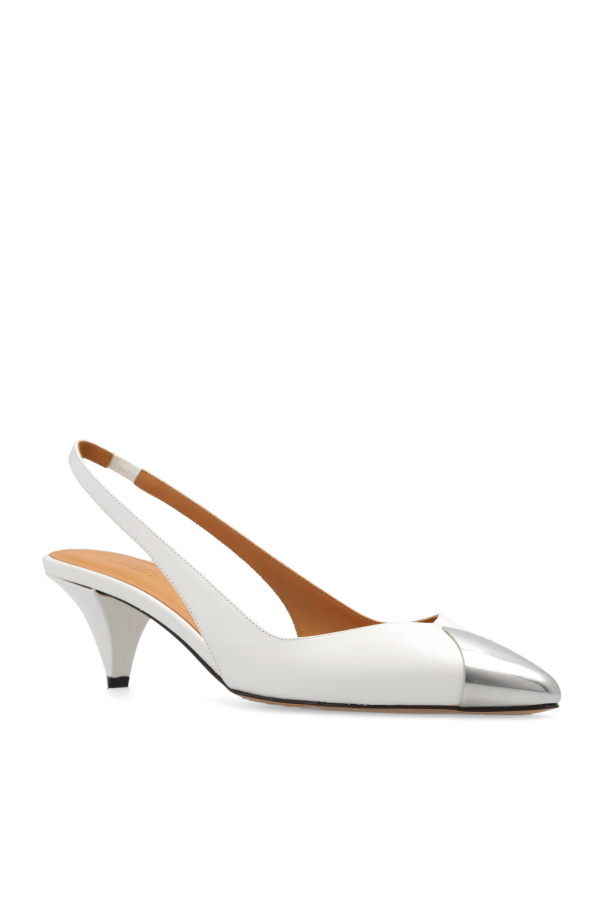 Cream ‘Elina’ pumps from Isabel Marant. Made from smooth leather with a pointed toe, this model sits on a beige leather sole and features an open heel and silver-tone hardware on the front.
