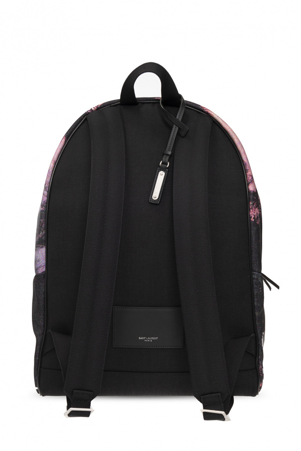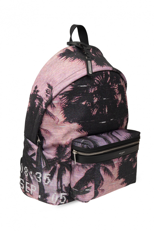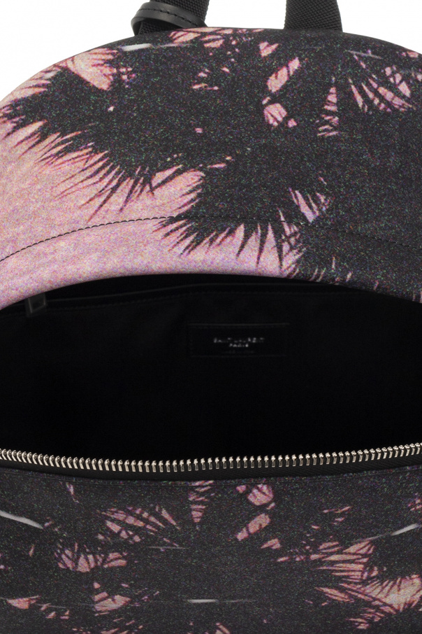 Multicoloured ‘City’ backpack from Saint Laurent. Crafted from ECONYL® (regenerated nylon) and trimmed with leather, this design secures with a two-way zip and showcases a palm tree print. It is complete with a removable tag with a logo application, an external zip pocket accompanied by a silver-tone logo print on the front, a half-round handle, adjustable shoulder straps and one internal compartment with one zip pocket and two slip pockets.