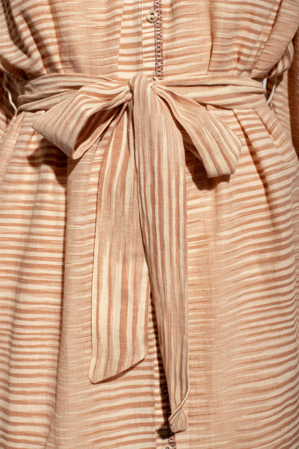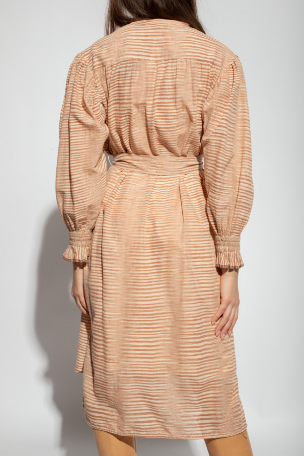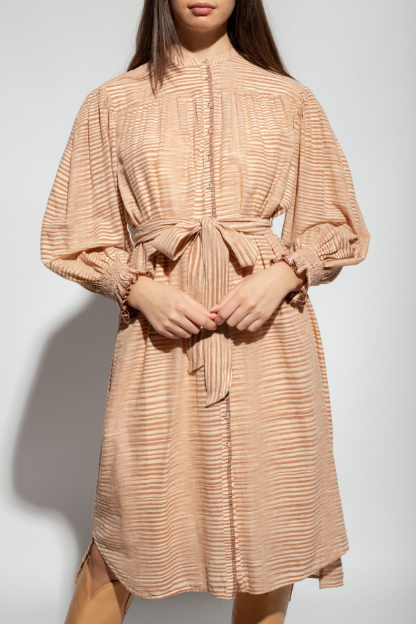 Beige and light brown ‘Fiora’ dress from Ulla Johnson. Made of cotton and decorated with a stripe pattern, this style features button fastenings, a waist-cinching belt, distinctive gathers on the front and long puff sleeves with embroidered elastic cuffs.
