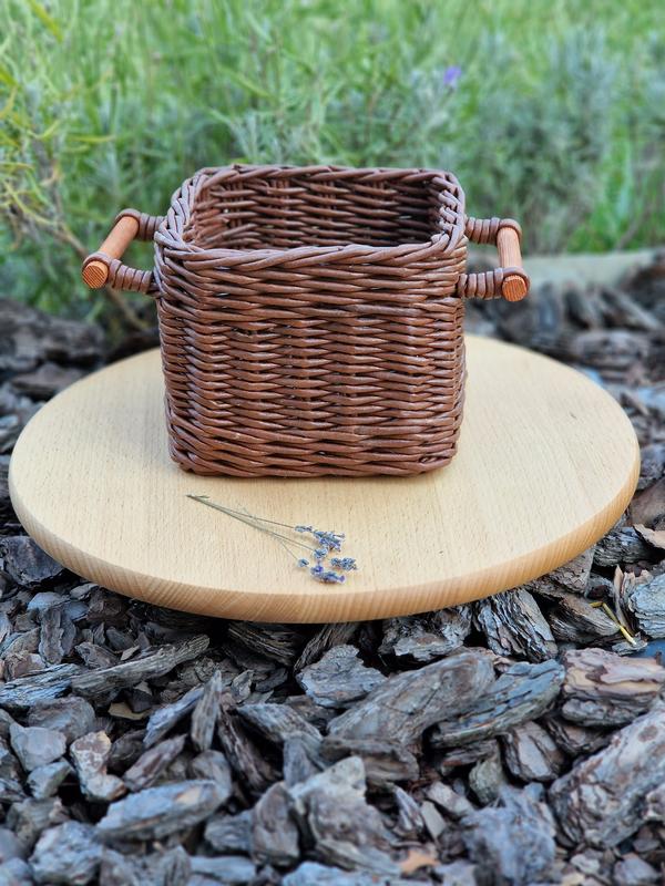 салфетница плетеная из бумажной лозы с деревянными руками. размеры 16×16, высота 12 см. может быть любого цвета и размера по вашему желанию