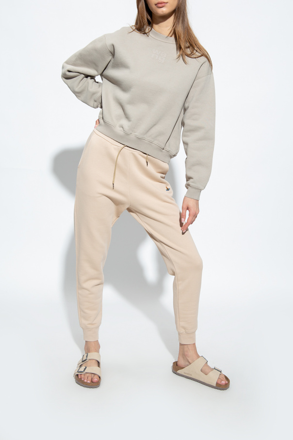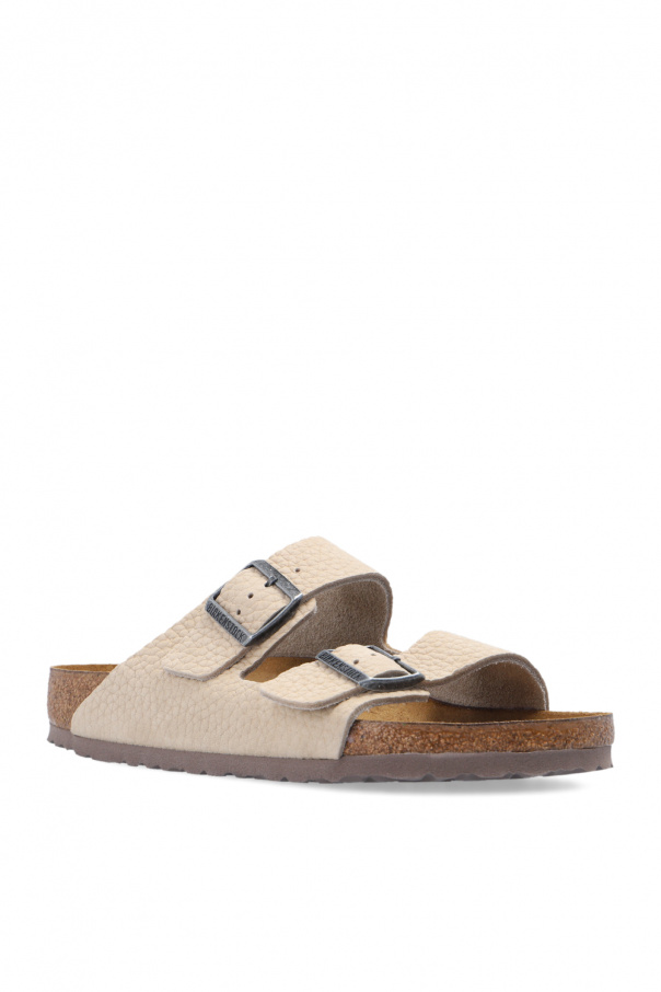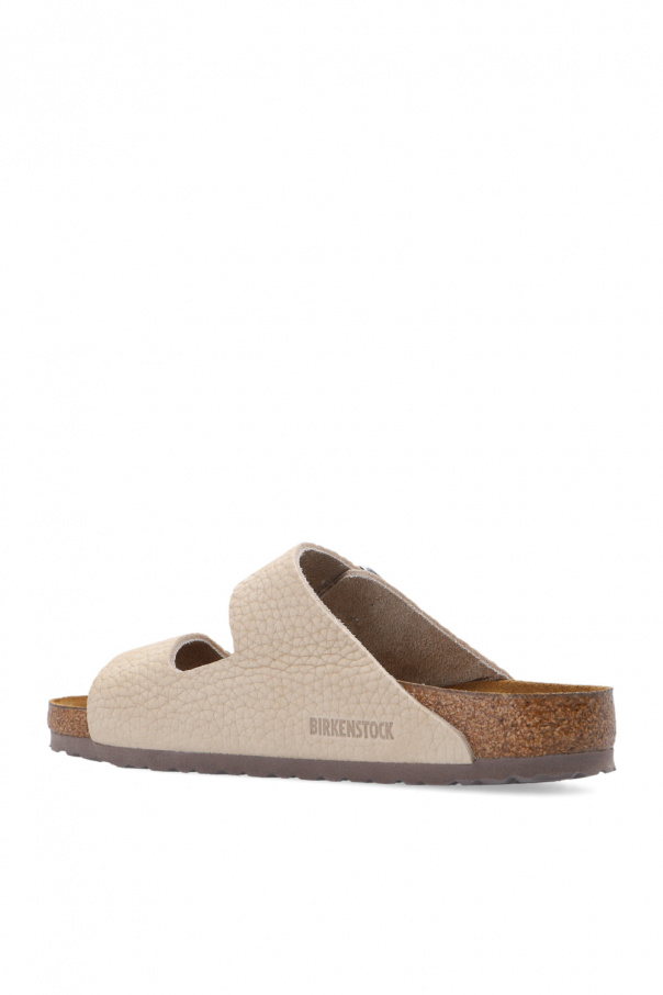 Light beige ‘Arizona BS’ slides from Birkenstock. Crafted from nubuck, this model features ankle straps with a branded buckle as well as a grey and brown sole made of cork and EVA foam.