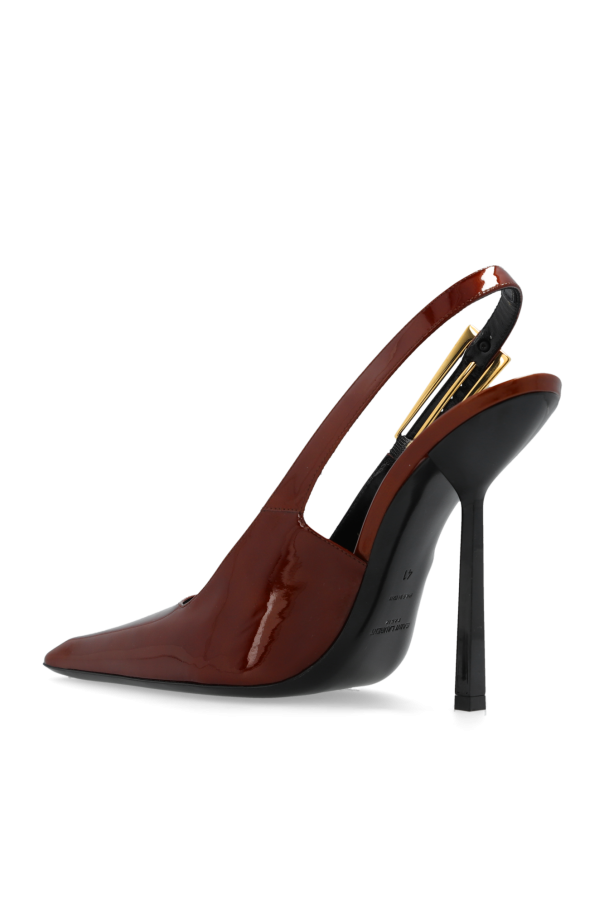 Brown ‘Lee’ slingback pumps from Saint Laurent. Made of leather with a pearl finish, this pair is set on a black leather sole and features a pointed toe and adjustable strap with a gold-tone buckle.