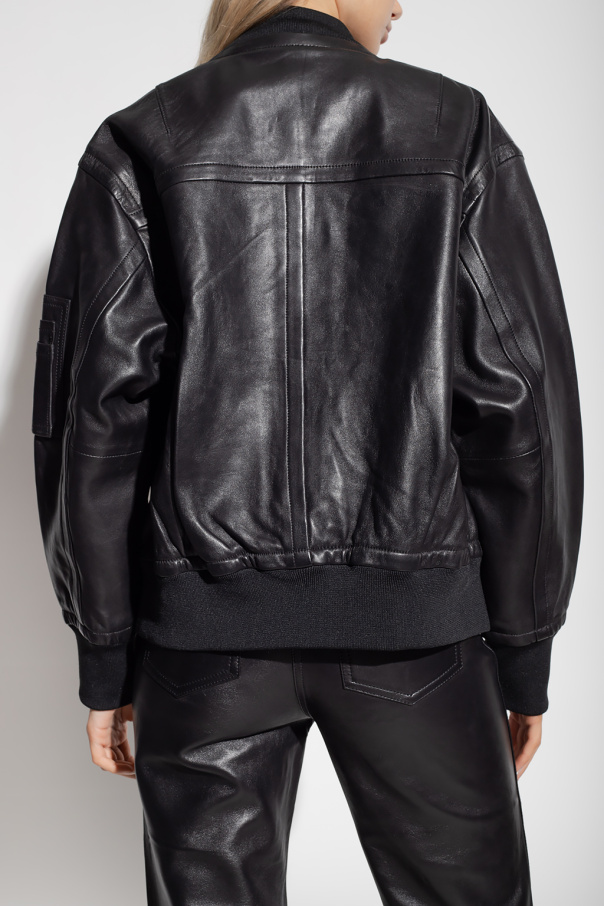 Black ‘Icon’ bomber jacket from Stand Studio. Crafted from lamb leather, this garment features a two-way zip, two snap-fastened flap pockets, sleeve pockets, ribbed edges, pink lining and silver-tone metal hardware.