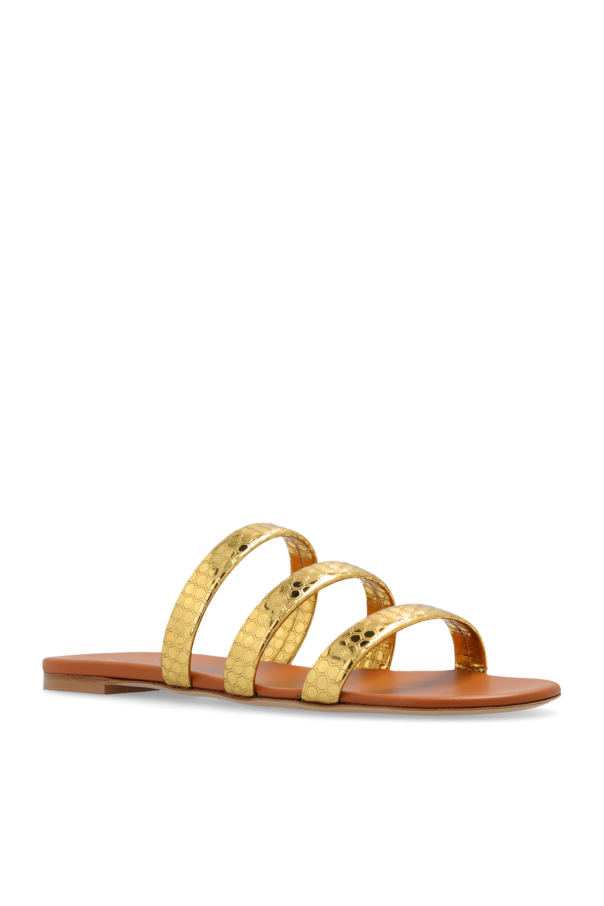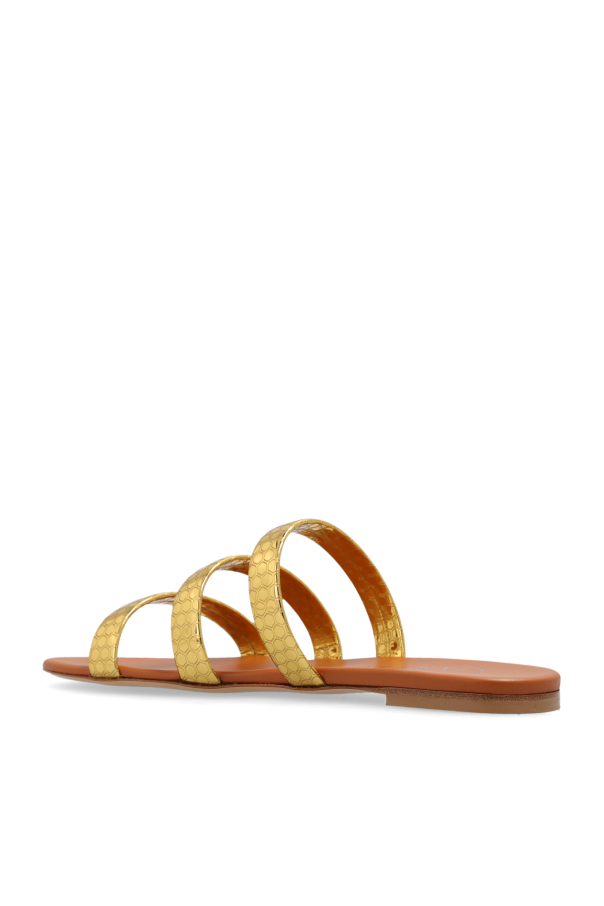 Gold-tone ‘Atomium’ slides from Casadei. Enriched by a metallic finish and geometric pattern, this design features leather trims, a round toe and beige leather sole.