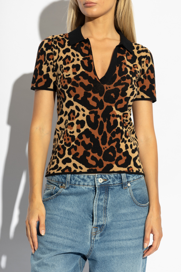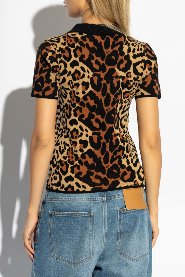 Introducing the Blumarine Animal Print Polo, an exquisite blend of elegance and boldness. This short-sleeved polo shirt showcases a striking panther motif in a captivating palette of brown, black, and beige, ensuring an eye-catching and sophisticated look. Designed with a classic cut, this polo features a contrasting black collar that elegantly complements the deep V-neckline, enhancing its refined character. Crafted from a high-quality fabric that feels luxuriously soft to the touch, this shirt promises both comfort and style. The meticulous attention to detail is evident in the black collar and the designer\'s logo subtly displayed on the inner collar tag, underscoring the exclusivity of this piece. Paired perfectly with loose-fit jeans, this polo offers a casual yet stylish ensemble. An up-close view of the fabric pattern reveals the intricacy and superior craftsmanship of this garment, making it a standout addition to any wardrobe. Why Buy This Product? Exclusive Design: Unique animal print that stands out. High-Quality Material: Soft and pleasant to the touch. Elegant Details: Deep V-neck and contrasting black collar. Versatile Styling: Perfect for casual yet chic looks. Designer Label: Featuring the Blumarine logo for added exclusivity.