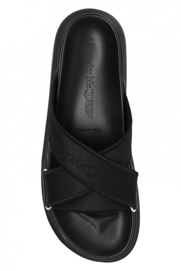 Black slides from Alexander McQueen featuring embroidered logo of the designer.