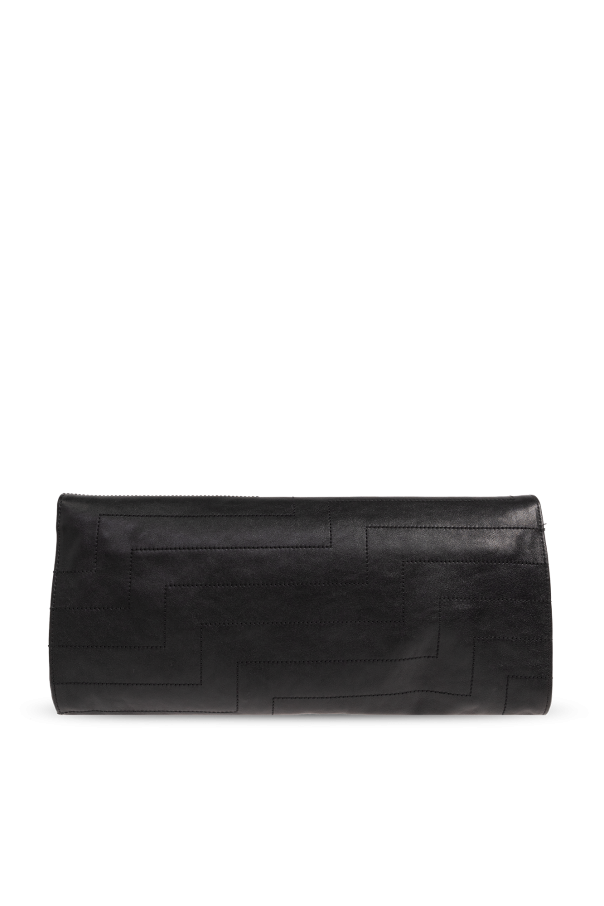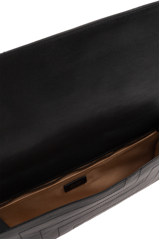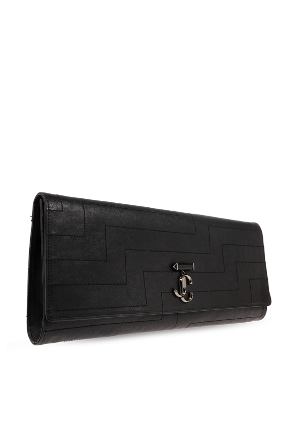 Black ‘Avenue’ clutch from Jimmy Choo. Made of calf leather, this design secures via a magnetic snap and showcases a logo plaque, exposed stitching details and one internal compartment with a zip pocket.