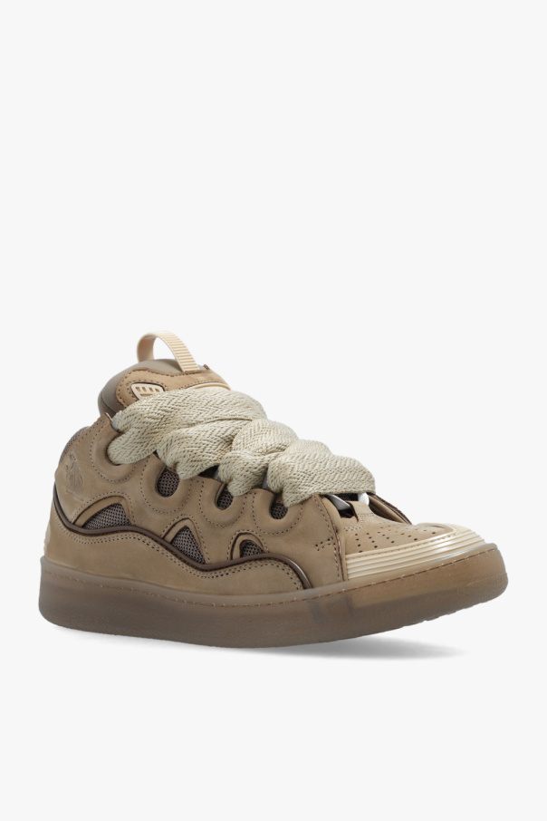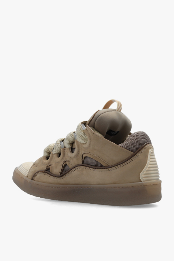 Beige and grey ‘Curb’ sneakers from Lanvin. Crafted from calf leather and fabric overlays, this lace-up model sits on a greyish beige rubber sole and showcases the brand\'s logo, rubber inserts, wide laces and perforations on the front.