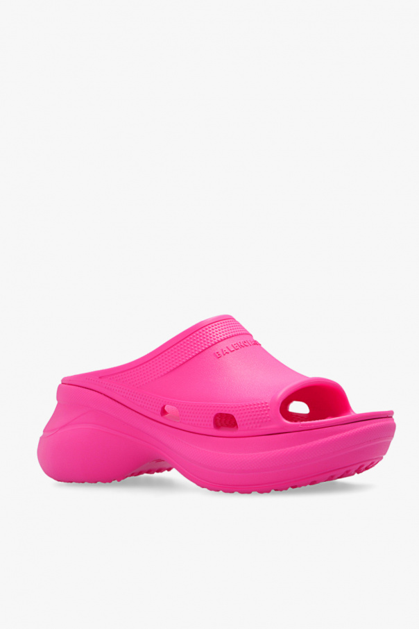 Neon pink ‘Pool’ platform slides from Balenciaga x Crocs™. Crafted from lightweight EVA foam, this model sits on a neon pink rubber sole and features a three-dimensional logo on the front.