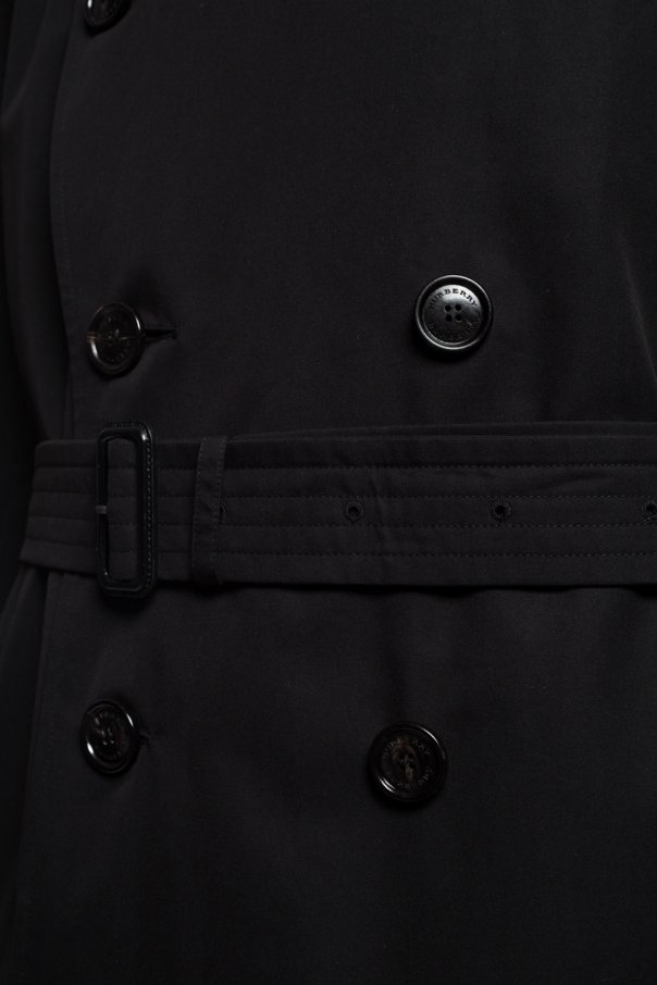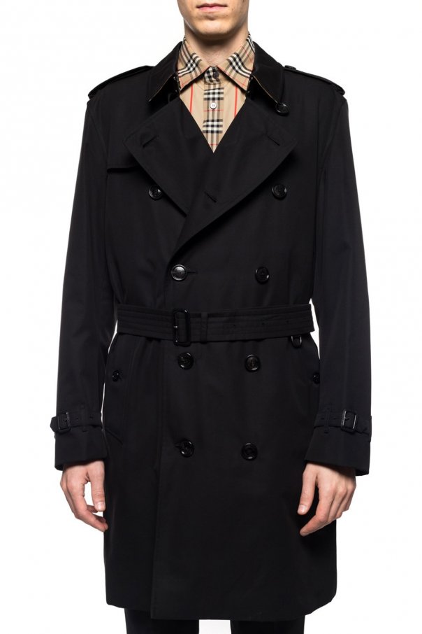 Black double-breasted trench coat from Burberry. Made of cotton. Fastened via buttons. Features buckle belt at the waist, epaulettes on the shoulders, 2 buttoned pockets on the front and single split vent on the back. Brown lining in cotton is embellished with signature check pattern.