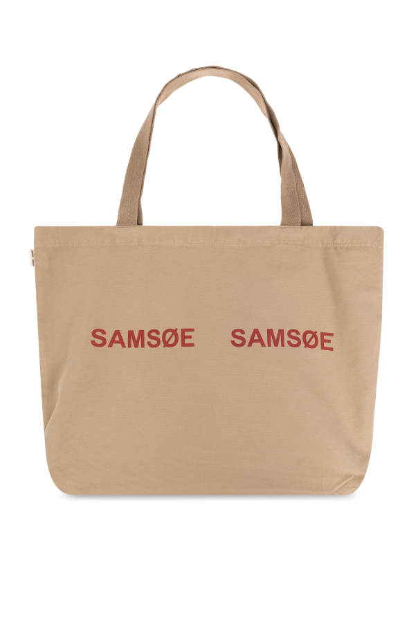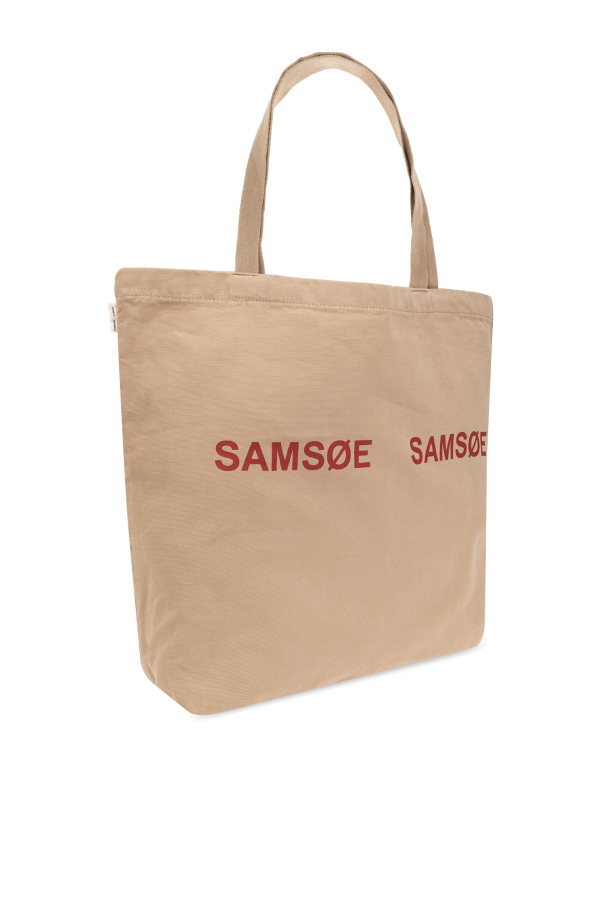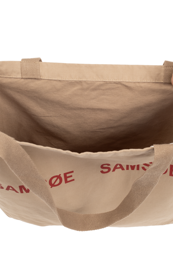 Beige ‘Frinka’ shopper bag from Samsoe Samsoe. Made from organic cotton with the GOTS certificate, this design showcases a printed red logo on the front, two handles and one internal compartment.