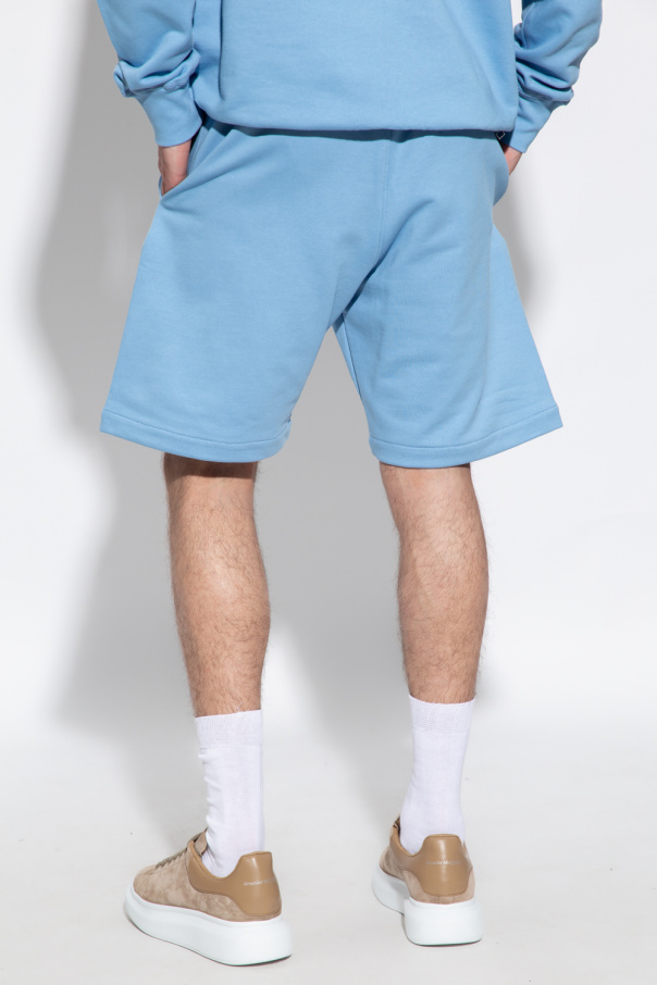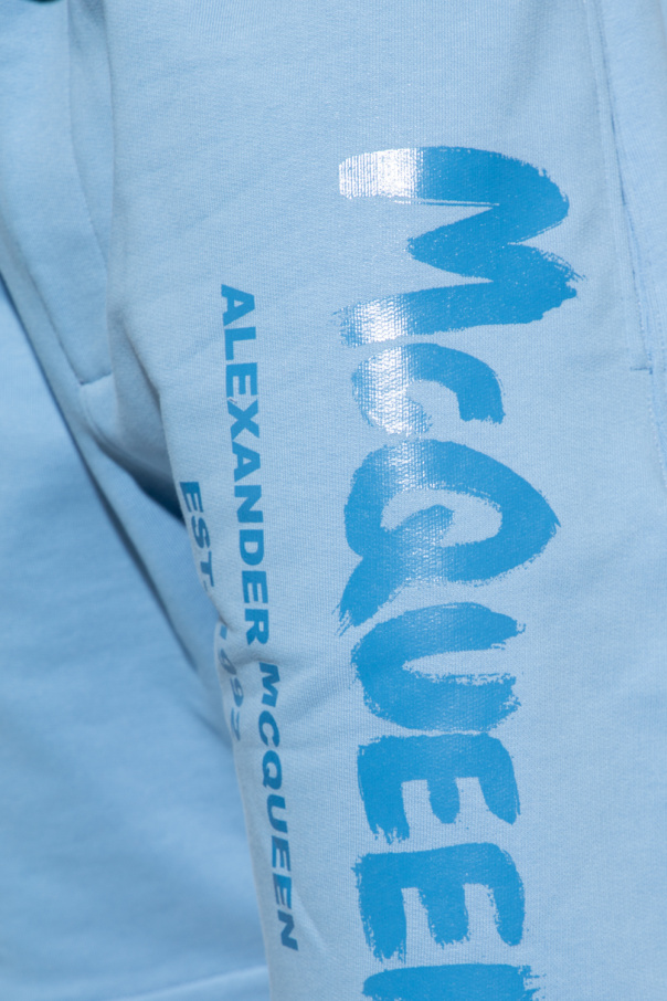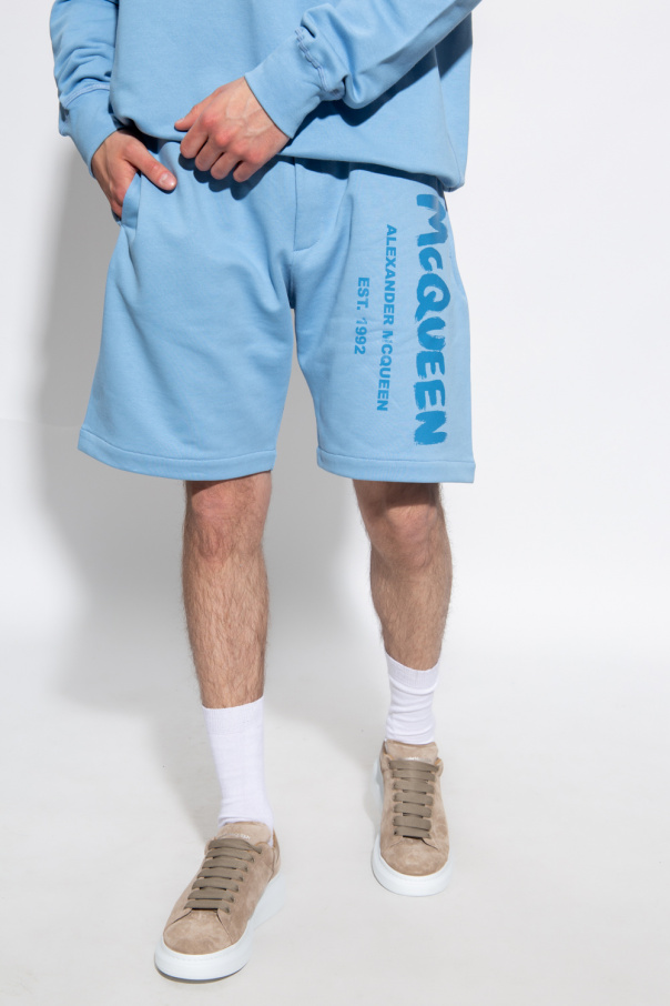 Blue shorts from Alexander McQueen. Made of cotton, this pair features a drawstring waist accompanied by a zip closure, two front slip pockets, one back zip pocket and a printed logo for brand recognition.