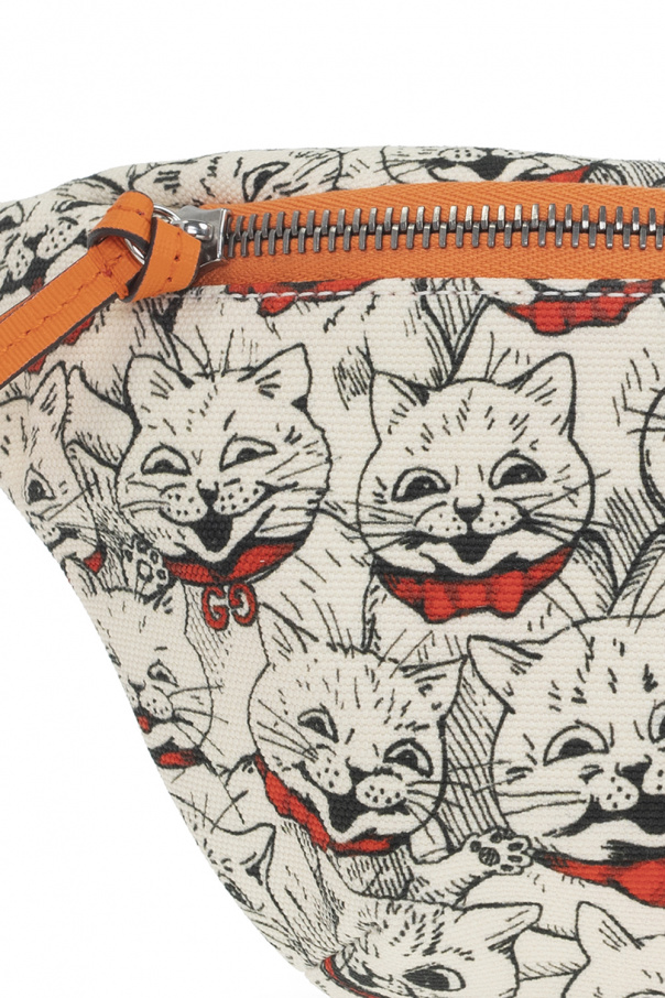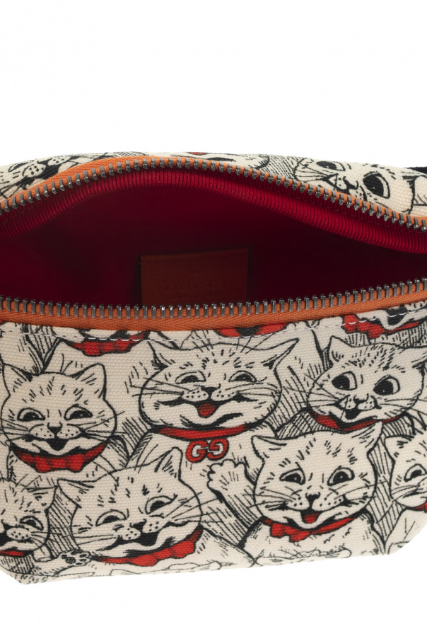 Beige belt bag from Gucci Kids. Made of canvas, this design features a zip closure with orange trims, cat print inspired by Louis Wain's illustrations, one internal compartment and adjustable belt with the iconic Web stripe in navy and red.