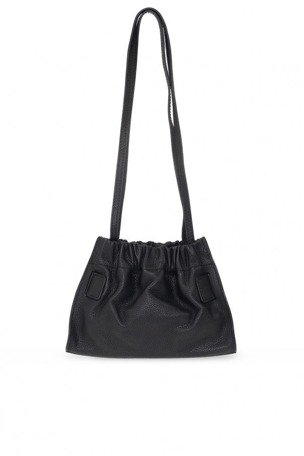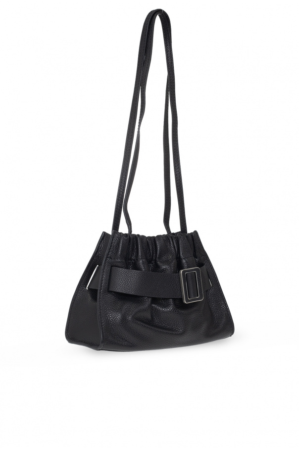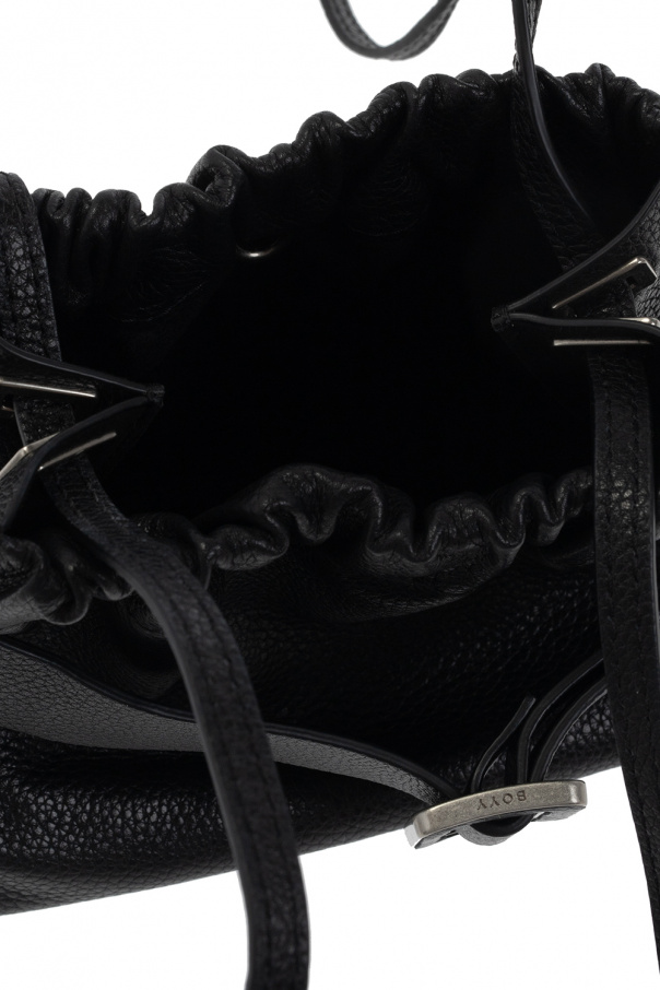 Black ‘Square Scrunchy Soft’ shoulder bag from Boyy. Made of calf leather, this design cinches closed with drawstrings and features a hook closure, a decorative buckle on the front, an adjustable shoulder handle, antiqued silver-tone metal hardware and a suede-clad interior with one compartment.