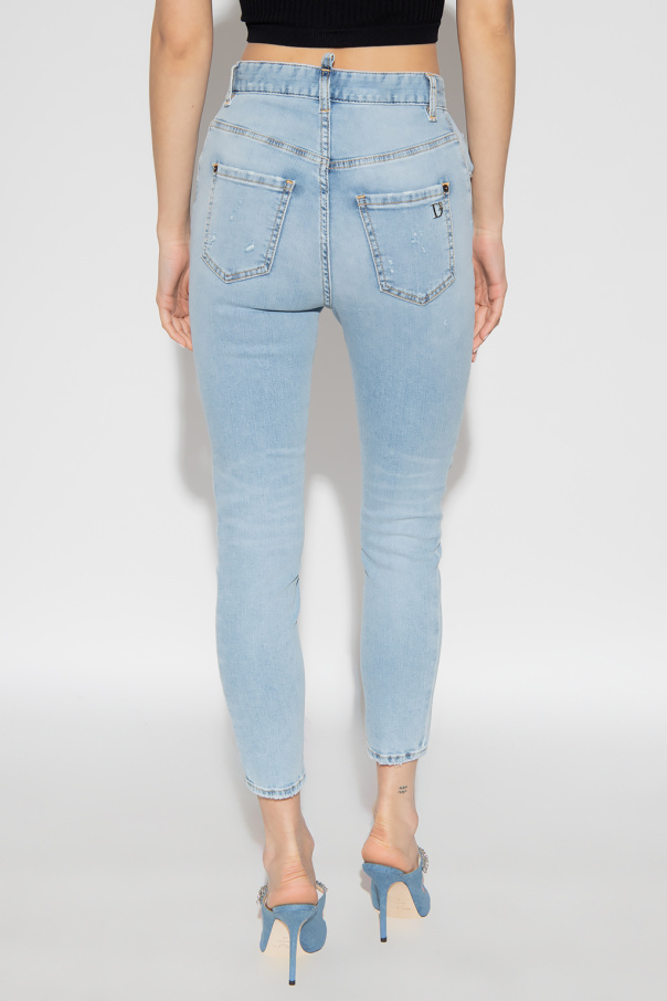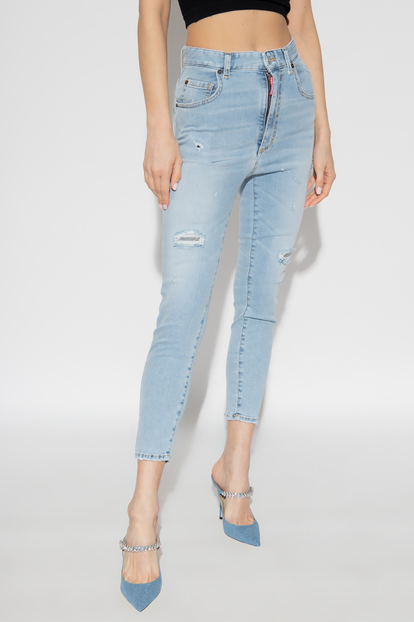 Light blue ‘Cropped Twiggy’ jeans with a vintage effect from Dsquared2. Made of cotton, this high-waisted pair falls down with slightly tapered legs and is complete with a zip and button fastening, silver-tone logo detail at the back and five slip pockets.