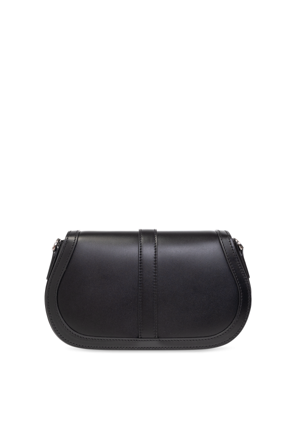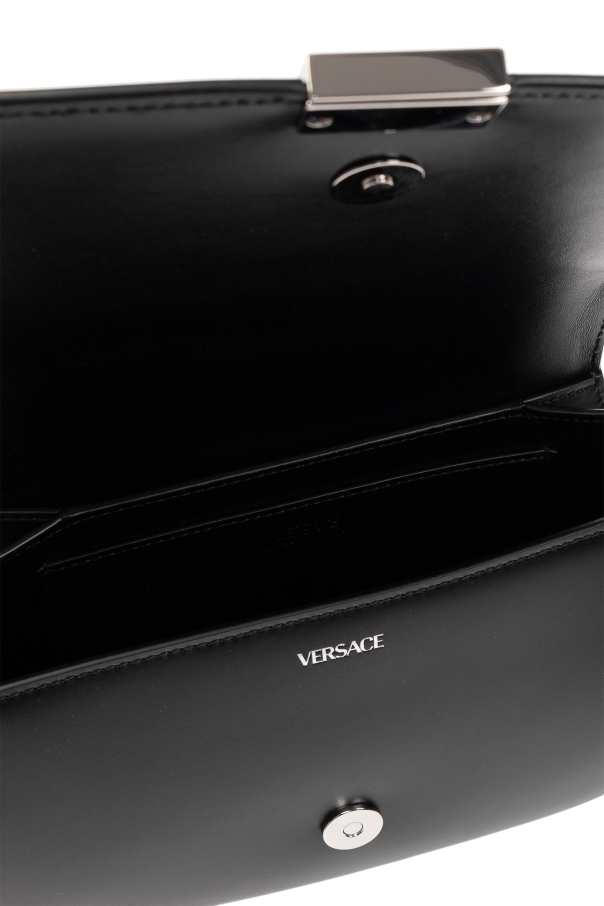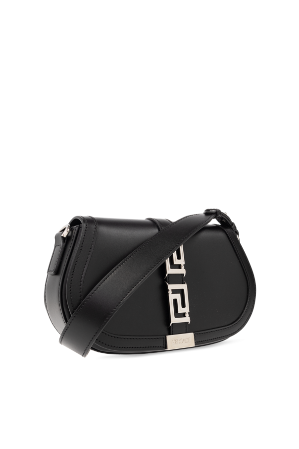 Black ‘Greca Goddess’ shoulder bag from Versace. Made of calf leather, this design fastens with a magnetic snap and showcases the brand\'\'s signature ‘Greca’ buckle on the front. It is complete with a detachable and adjustable leather strap, one chain and leather strap, silver-tone metal hardware and one internal compartment a slip pocket.