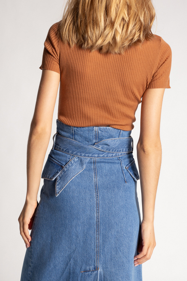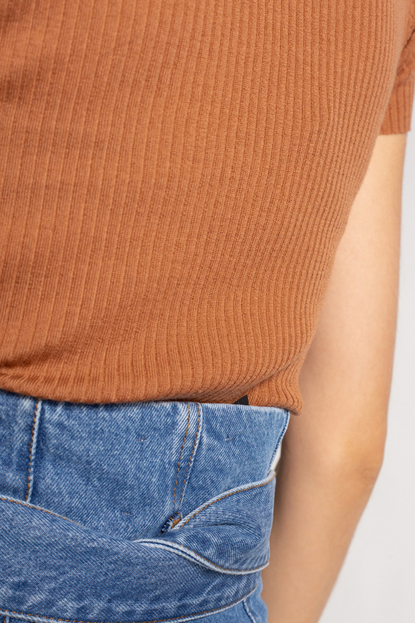 Brown polo from Nanushka. Crafted from wool with ribbed detailing, this style features a collar with a button placket, short sleeves and an embroidered logo on the front.