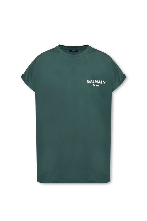Dark green T-shirt from Balmain. Made of organic cotton with the GOTS certificate, this short sleeve design features a white logo with a velvet finish and a ribbed crew neck.