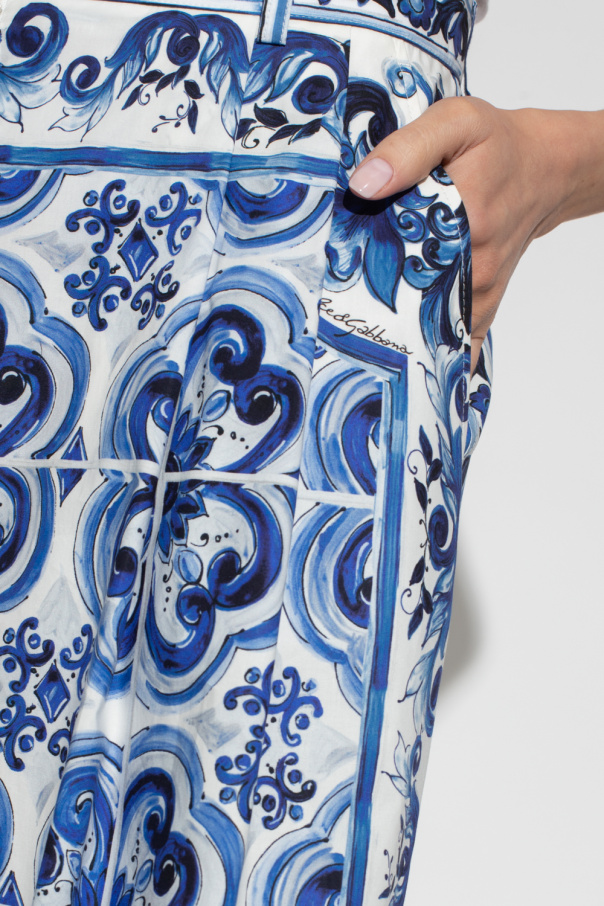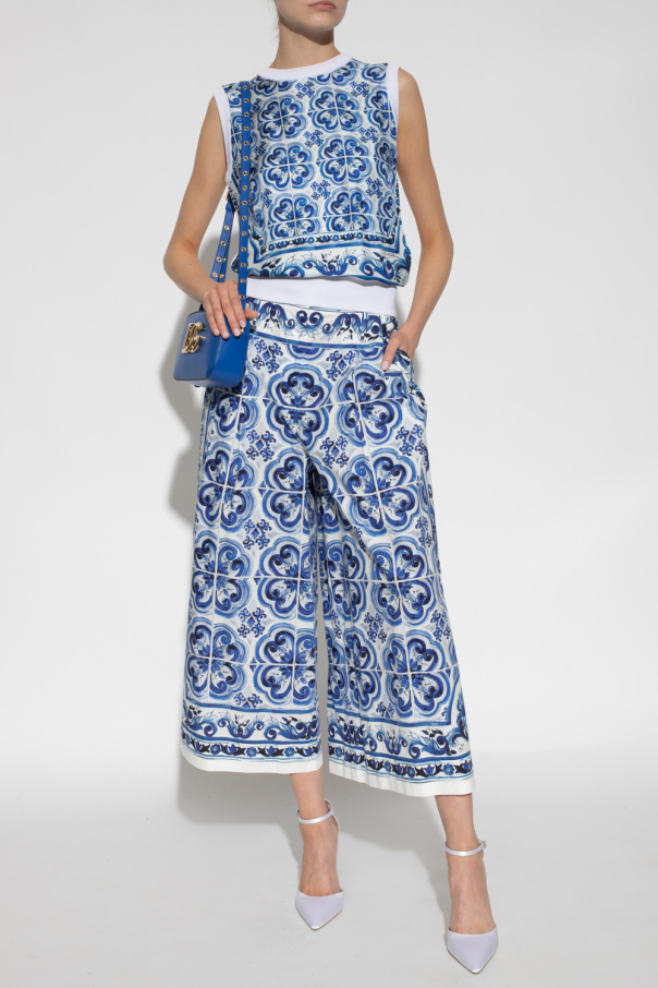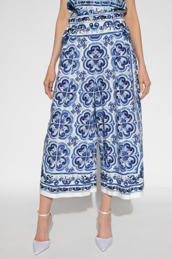Blue, white and navy blue culotte trousers from Dolce & Gabbana, the ‘Blu Mediterraneo’ collection. Embellished with a Mediterranean floral print inspired by majolica tiles, this pair features a high-rise waist, a zip fly with a button, four slip pockets and flared legs.