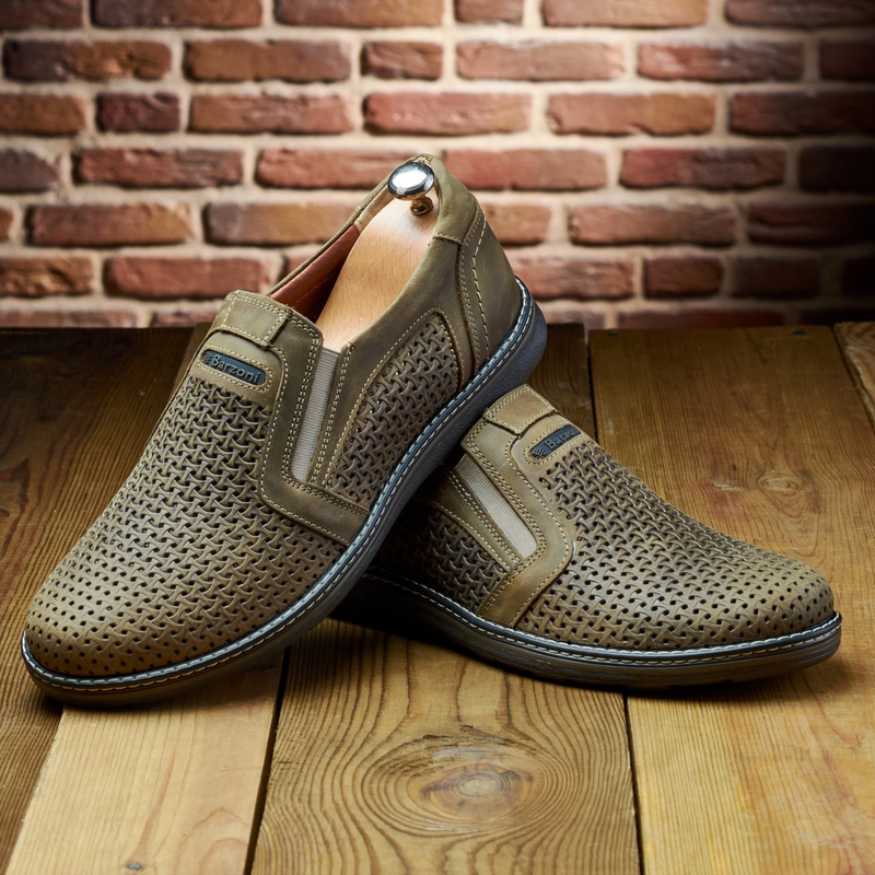 Летние оливковые мужские дышащие туфли кожаные с перфорацией,натуральная кожа-мужская летняя обувь