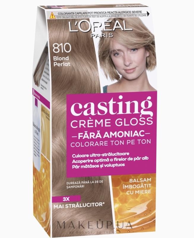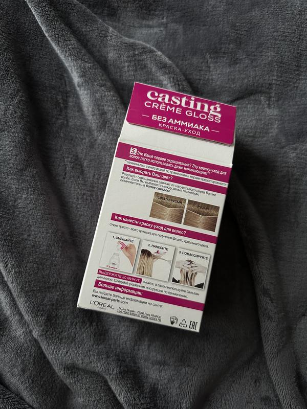 L'Oréal Paris Casting Crème Gloss — це стійке фарбування до 28 використань шампуню. Фарба оптимально зафарбовує сивину, робить волосся м'яким і доглянутим. Оновлені бальзами після фарбування з натуральними інгредієнтами містять масло кокоса для відтінків брюнет, лісові горіхи для каштанових тонів, мед — для блонда, ягоди годжі — для рудих відтінків.