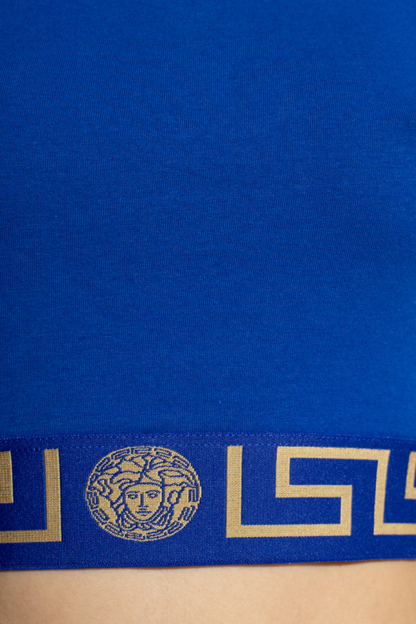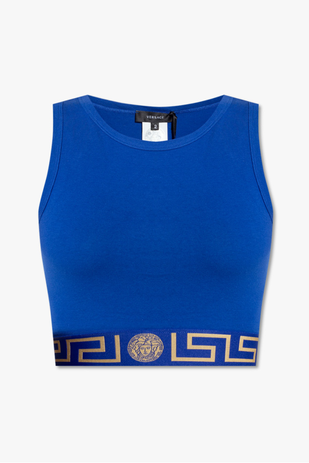 Blue tank top from Versace, the ‘Underwear’ collection. Crafted from cotton with a cropped fit, this style features a round neck and an elasticated waistband with beige embroidery including the brand\'s signature Medusa and Greca motifs.