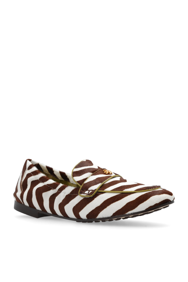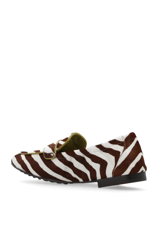 Brown and white loafers from Tory Burch. Made from natural cow fur embellished with an animal motif, this model sits on a light beige leather sole with brown rubber applications and showcases a frontal strap with gold-tone ‘Double T’ hardware and green calf leather trims.