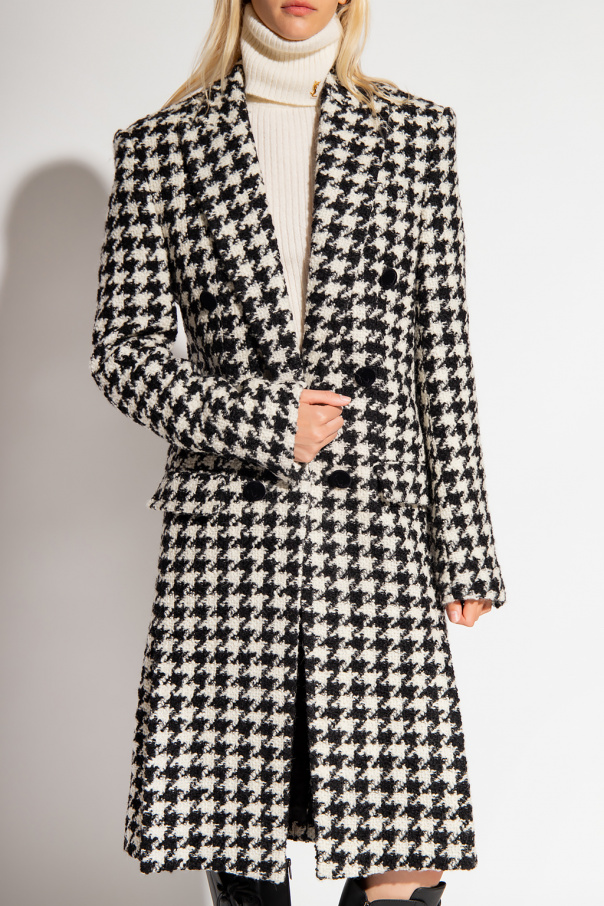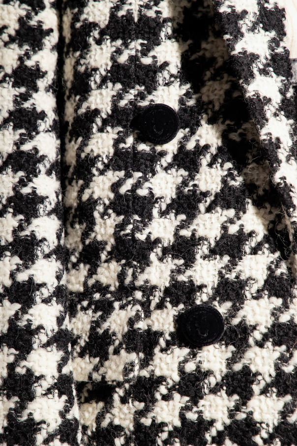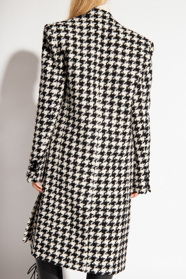 Black and cream coat from Balmain. Crafted from wool, this garment features a houndstooth pattern, velvet finish, two flap pockets, one slip pocket, peak lapels, two front pockets, one back pocket and long sleeves with velvet buttons.