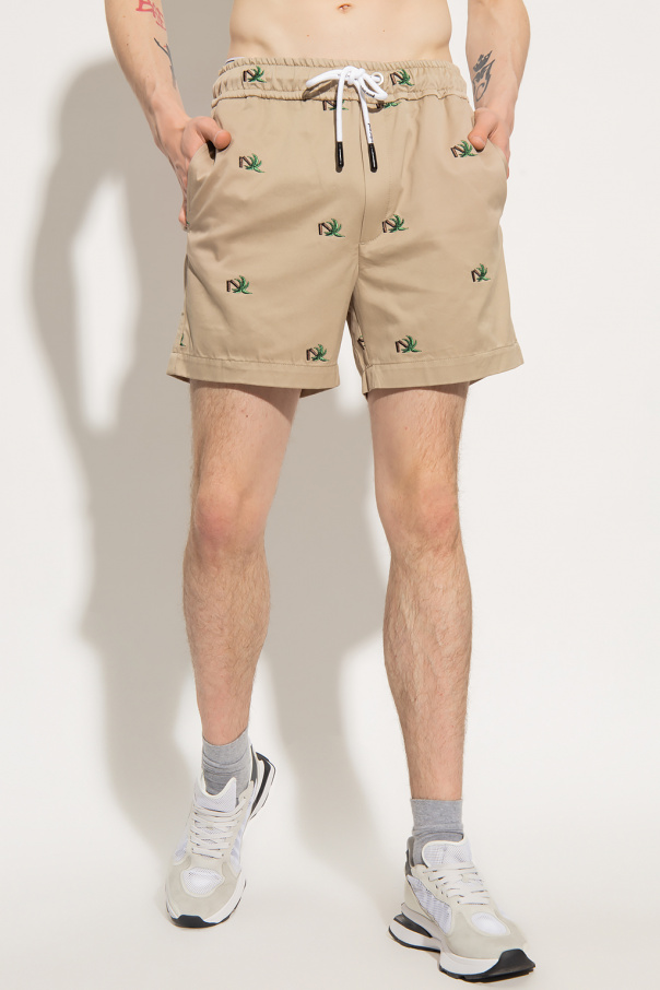 Beige shorts from Palm Angels. Made of cotton, this pair showcases floral embroidery, a drawstring waistband, two slip pockets and one button pocket.