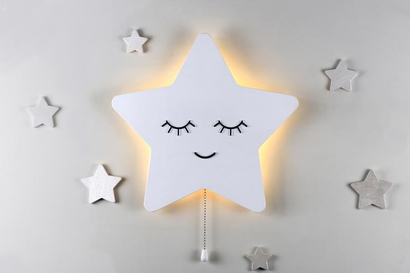 Настінний світильник ручної роботи з живленням від мережі 220 у формі милої білої зірочки. Наш бездротовий приліжковий нічник декорований оченятами, що гарно мерехтять приглушеному світлі. Така приліжкова лампа-зірочка безсумнівно чудово доповнить інтер'єр дитячої та прикрасить її стіни. Під'єднання за типом настінного бра.
