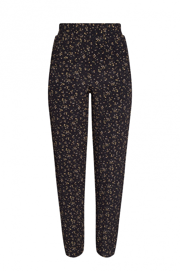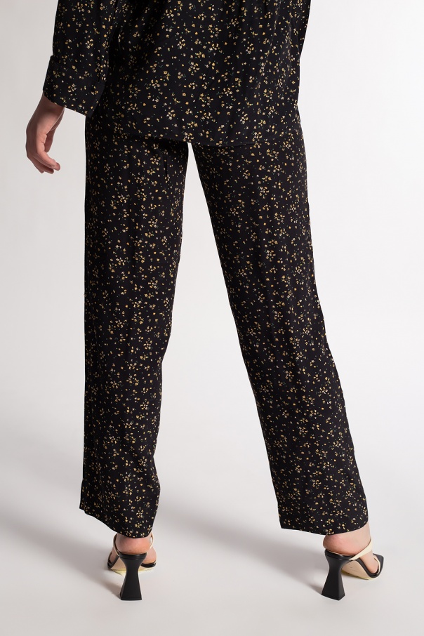 Black trousers from Ganni. Decorated with a yellow and green floral print, this garment features an elastic waistband, two slip pockets and tapered legs.