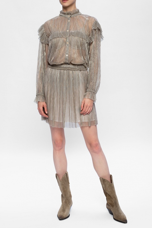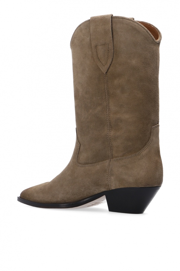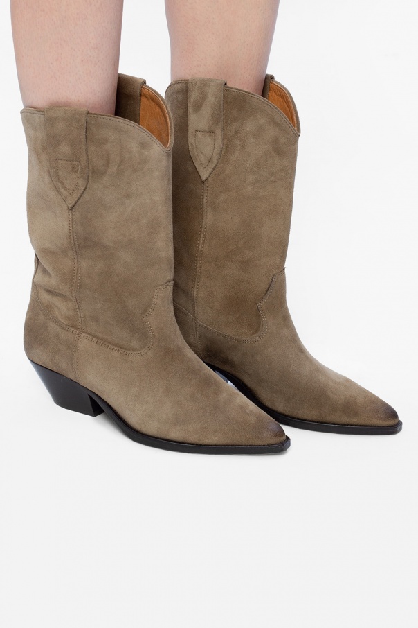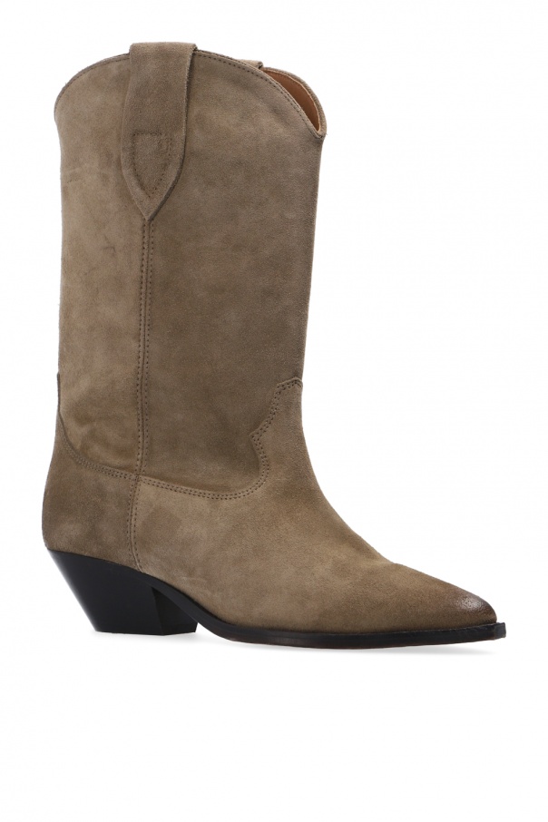 Light grey ‘Denvee’ knee-high cowboy boots from Isabel Marant. Crafted from suede, they are distinguished by stitching details. This pair also features pointed toe, brown lining, stacked heel and brown leather sole.