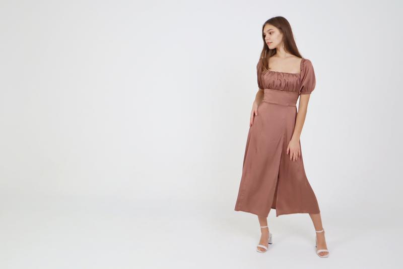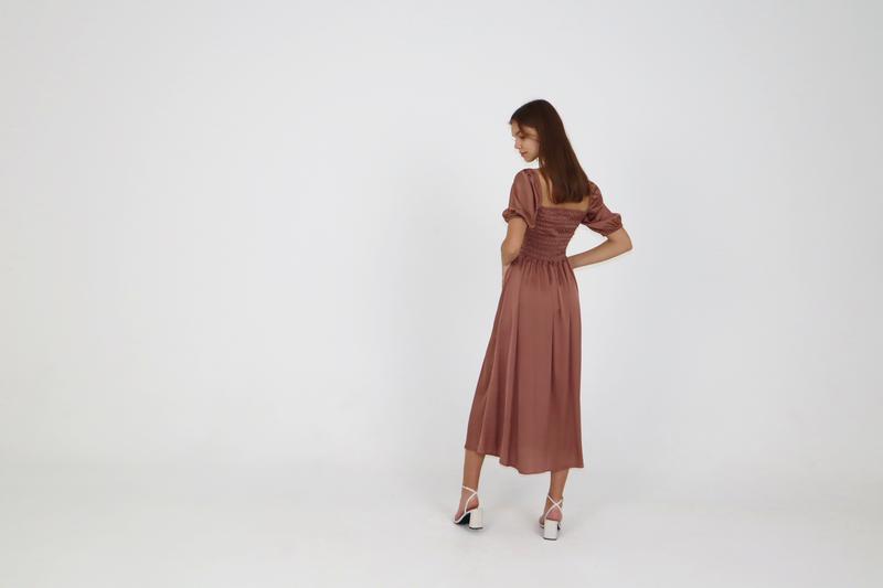 Сатинова святкова сукня кольору капучино. Має подвійну тканину в області грудей, прошита ниткою-резинкою спинка