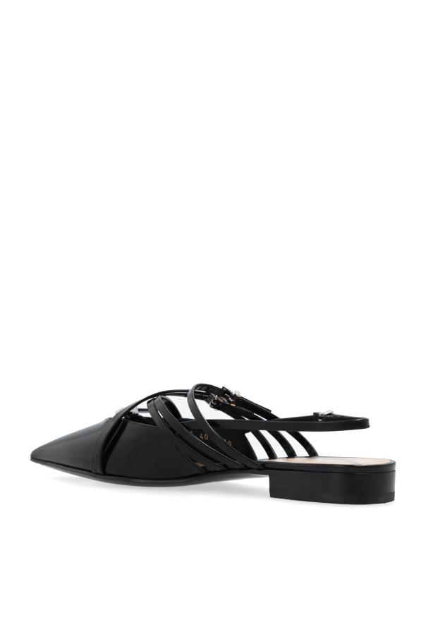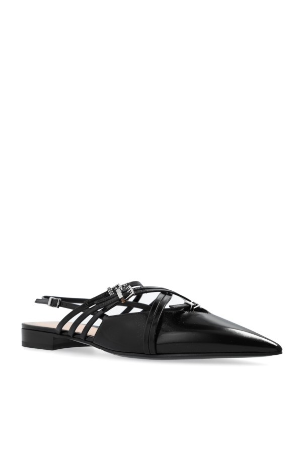 Introducing the exquisite Strappy Ballerinas by Gucci, a paragon of elegance and contemporary design. These black ballerinas feature an elongated, pointed toe that exudes sophistication and modernity. Intricately designed with multiple slender straps crossing at the front, these shoes are a perfect blend of originality and style. Crafted from premium, glossy leather, these ballerinas radiate luxury. The silver buckles on the straps are not only decorative but also functional, allowing for an adjustable fit. Inside, the insoles proudly display the inscription \"GUCCI Made in Italy\", a testament to their superior quality and heritage. With their dominant black hue, these shoes are versatile enough to complement a myriad of outfits, making them ideal for both formal and casual occasions. Why Choose This Product? Exquisite design with an elongated, pointed toe. Premium glossy leather for a luxurious finish. Adjustable silver buckles for a perfect fit. Versatile black color that complements various styles. Crafted by Gucci, synonymous with unparalleled Italian craftsmanship.