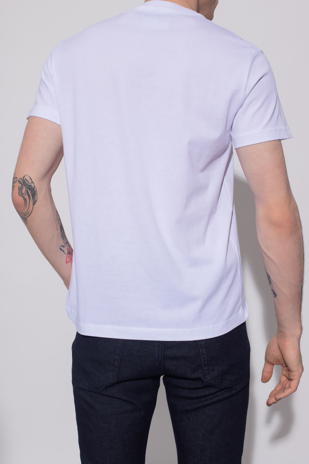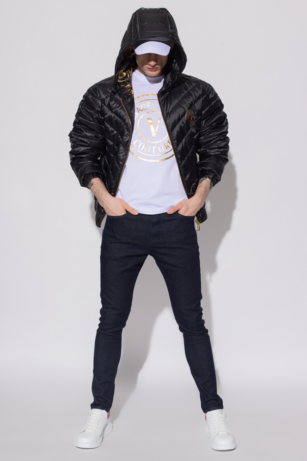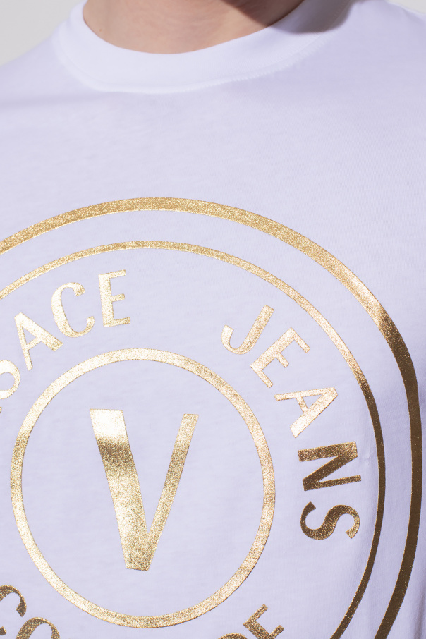 White crewneck T-shirt from Versace Jeans Couture. Made of cotton, this style showcases a gold-tone graphic print with the brand\'s logo on the front.