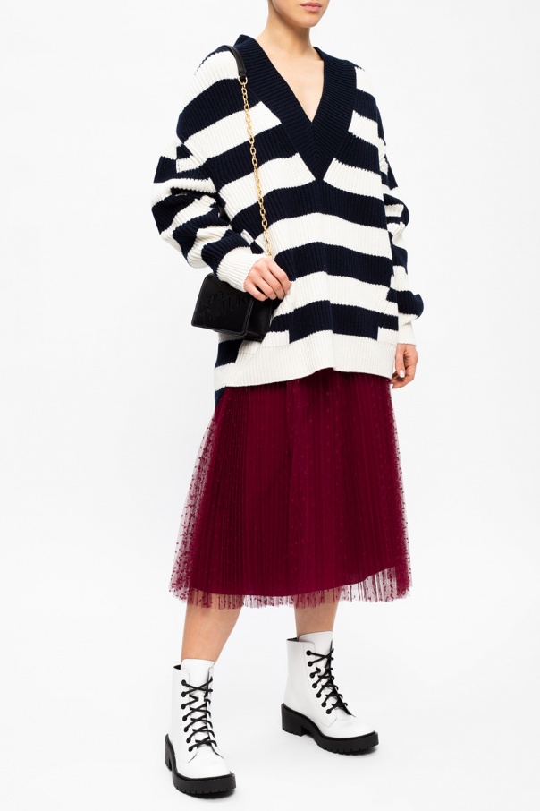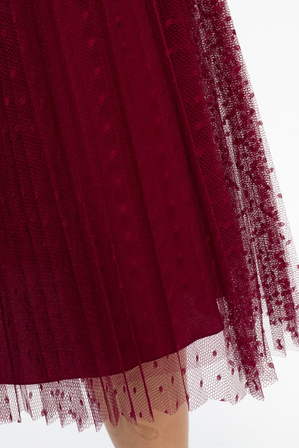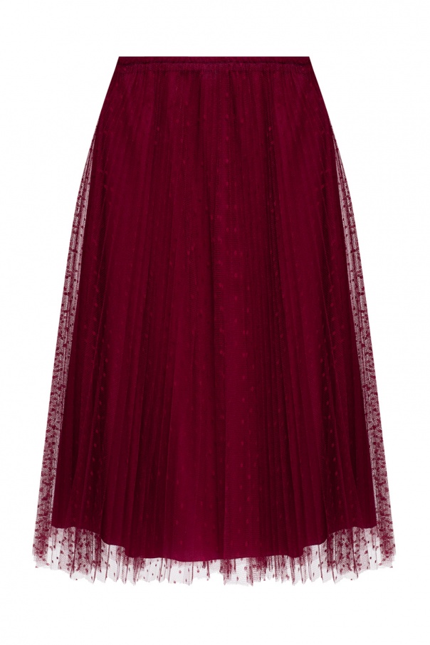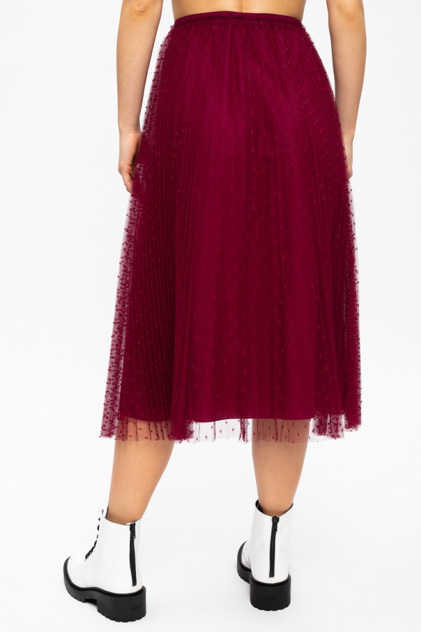 Maroon skirt from Red Valentino. Rendered in a tulle fabric with pleats, this style boasts a grosgrain trim at the waist and a dotted motif throughout.