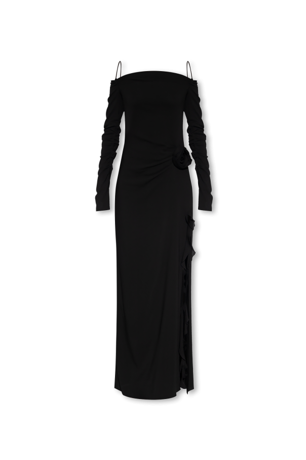 Black maxi dress from Blumarine. Cut with a form-fitting silhouette, this style fastens with a hidden side zipper and features a tie neckline, denuded shoulders, long sleeves with gathered detailing, frontal opening with a ruffle and a distinctive rose appliqué on the hip.