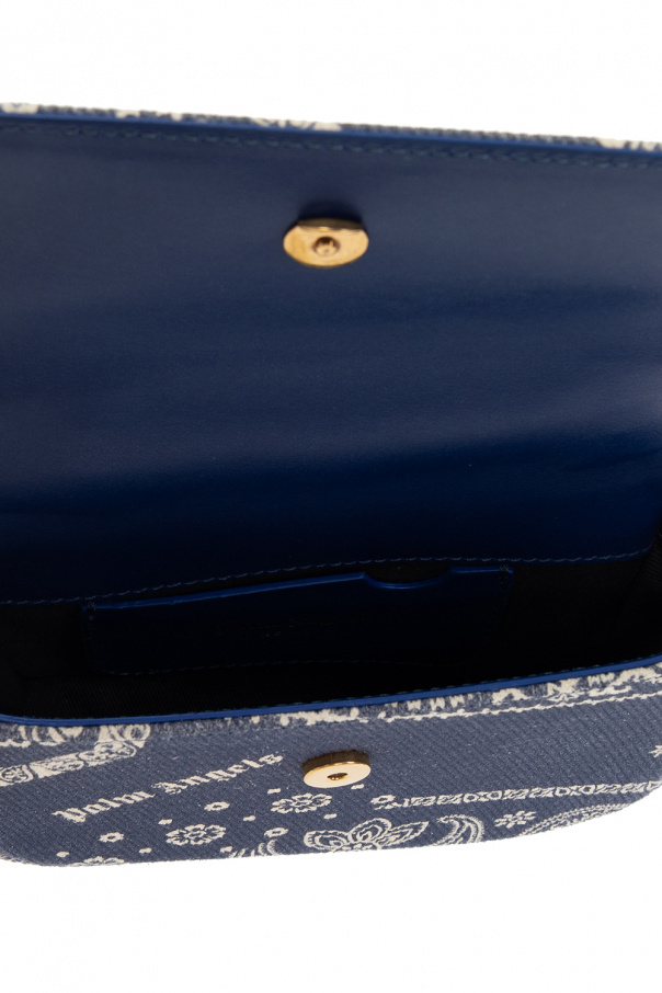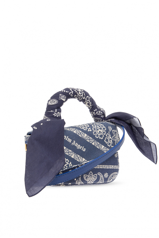 Navy blue ‘Crash Mini’ shoulder bag from Palm Angels. Crafted from cotton, this design showcases a paisley pattern and a vintage treatment. It is complete with a flap with a snap closure, a half-round handle accentuated with a bandana, a detachable and adjustable leather shoulder strap, gold-tone metal hardware and one internal compartment with a card slot.
