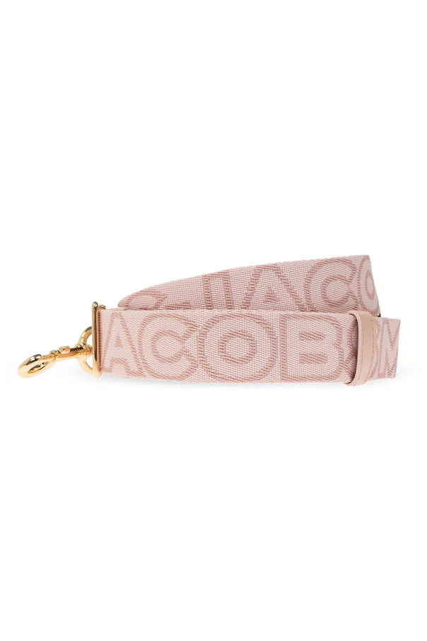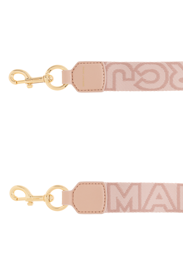 Light pink adjustable bag strap from Marc Jacobs. Made of fabric with leather trims, this item features a white logo embroidery and gold-tone metal carabiner clips.
