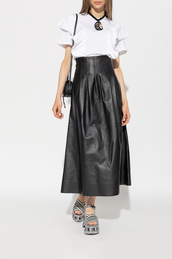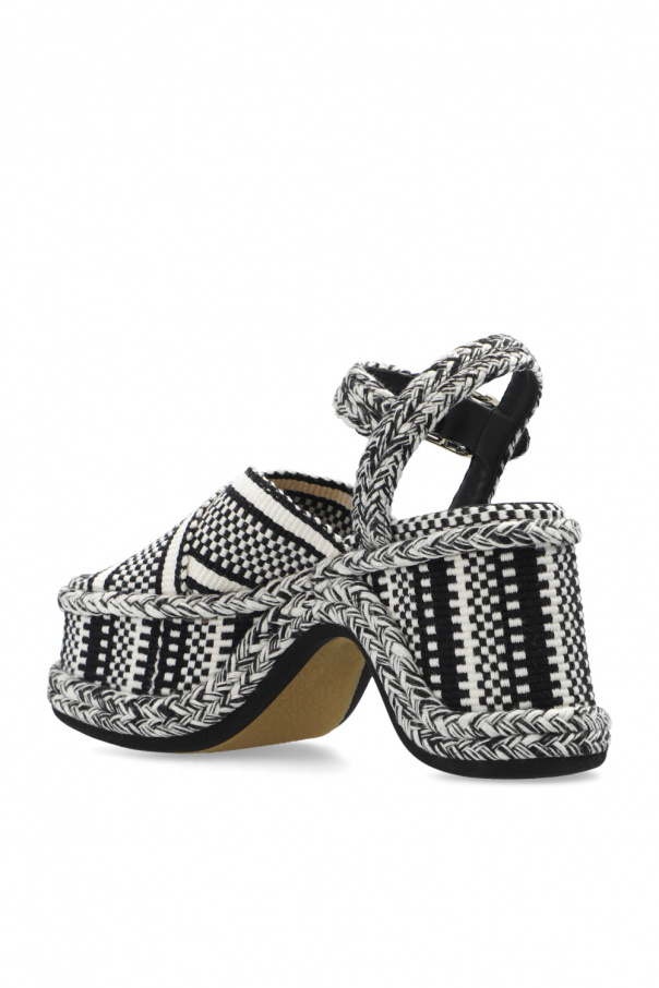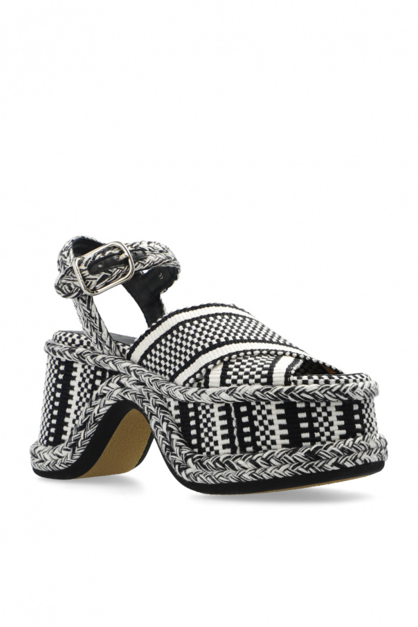 Black and white ‘Meril’ platform sandals from Chloé. Made of fabric and leather, this pair features an embroidered geometric pattern, woven buckled ankle strap and rubber sole in beige and black. Created in partnership with Amambaih, a social enterprise whose mission is to offer income-generating employment opportunities to the Maka artisan community in Paraguay. Faithful to the unique Maka designs, all the braids and textiles used to create the Meril sandals were woven by hand, giving them their unique, irregular character.