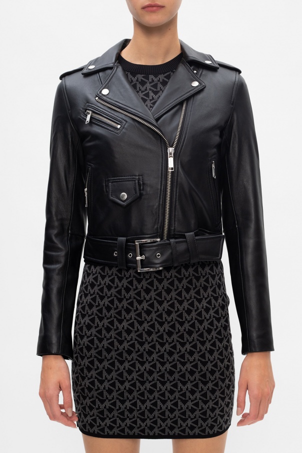 Black biker jacket from Michael Michael Kors. Crafted from lamb leather, this long sleeve design features notch lapels, three zip pockets, one snap pocket, zip details at the cuffs and a buckle belt at the hem.