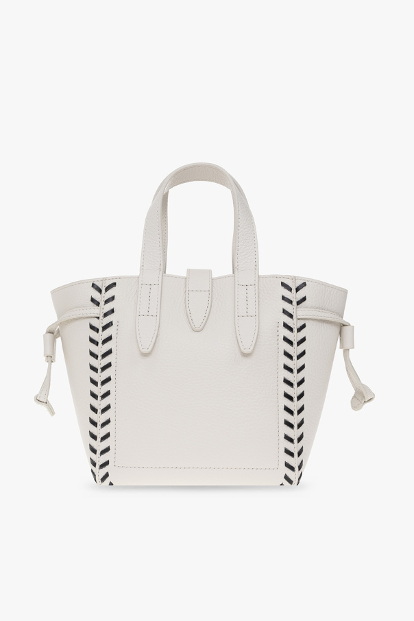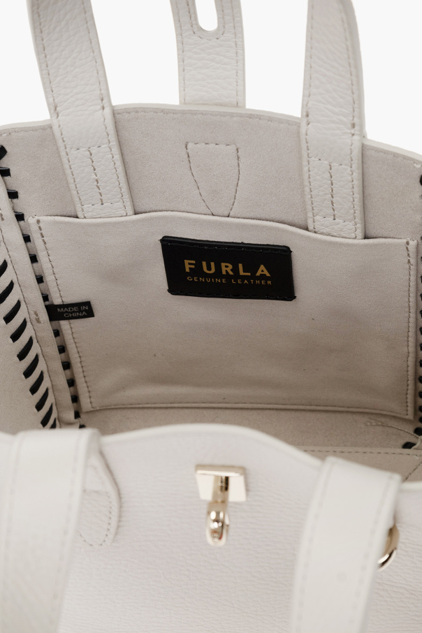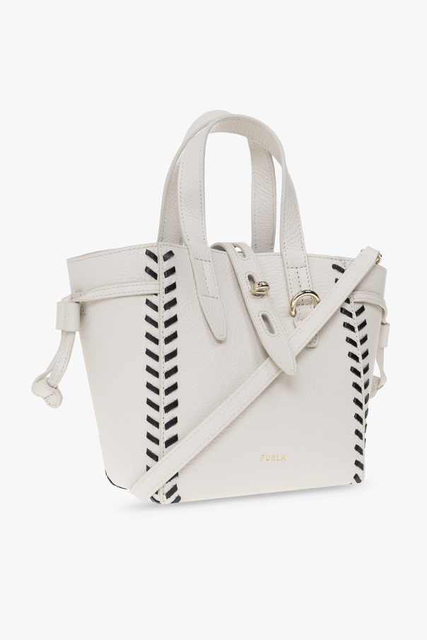 White ‘Net Mini’ shopper bag from Furla. Crafted from leather, this design secures with a distinctive fastener and features a printed logo on the front, decorative black topstitching, two half-round straps, gold-tone metal hardware and one internal compartment with a slip pocket.