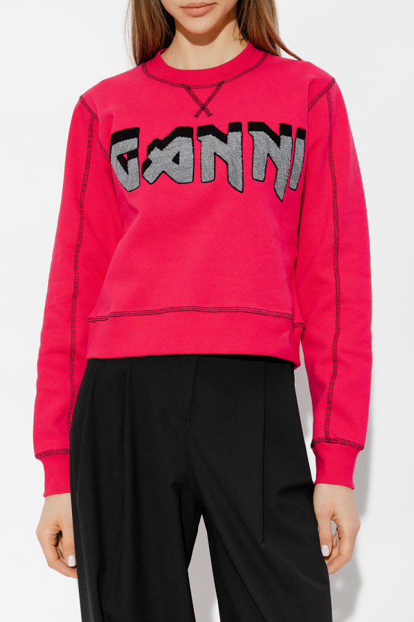 Dark pink crewneck sweatshirt from Ganni. Crafted from organic cotton, this style showcases grey and black logo embroidery on the front, contrasting black stitching details, long sleeves and ribbed trims on the edges.