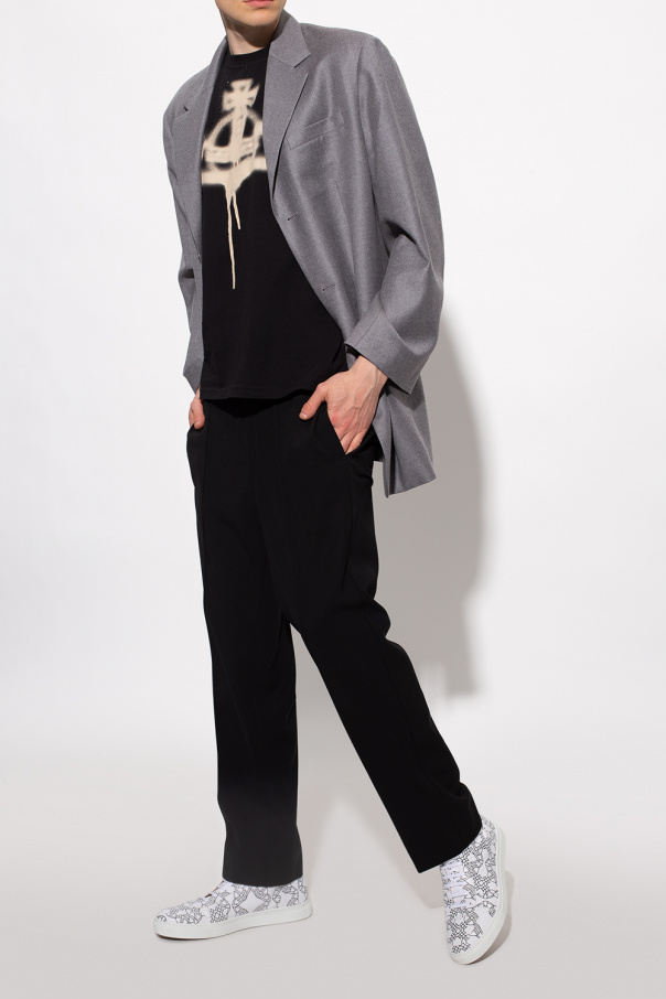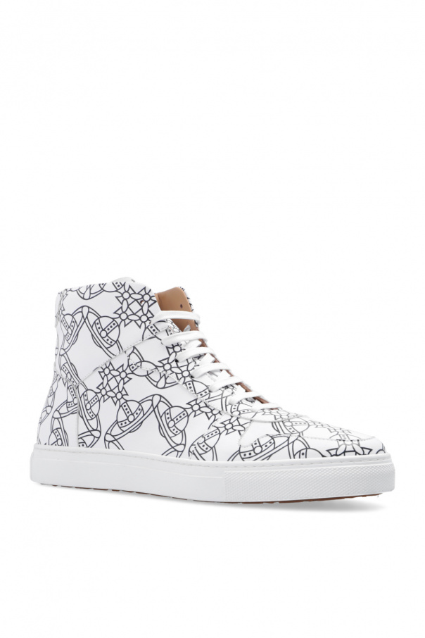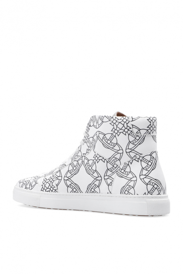 White ‘Apollo’ high-top sneakers from Vivienne Westwood. Crafted from leather, this lace-up pair features a black logo pattern and rubber sole in brown and white.