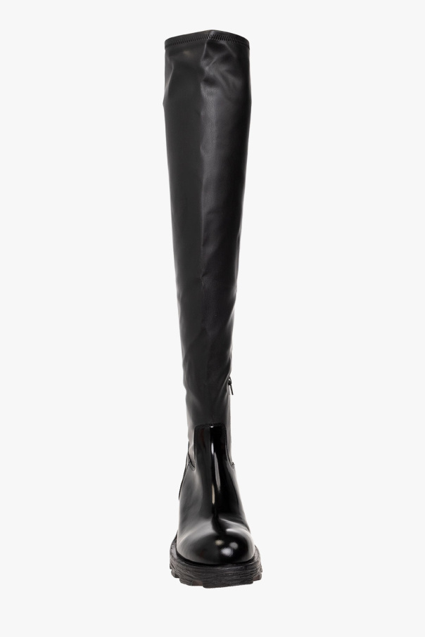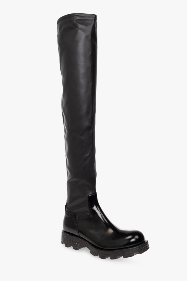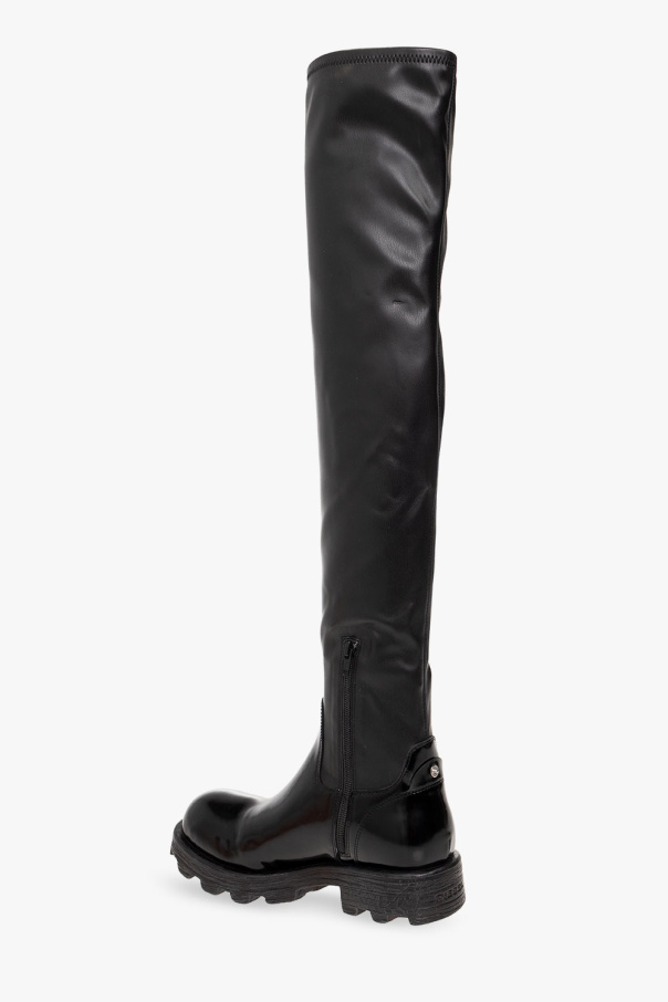 Black ‘D-HAMMER’ over-the-knee boots from Diesel. Crafted from leather and rubber, this model features a round toe, a metal application at the back and a black rubber sole at the base.