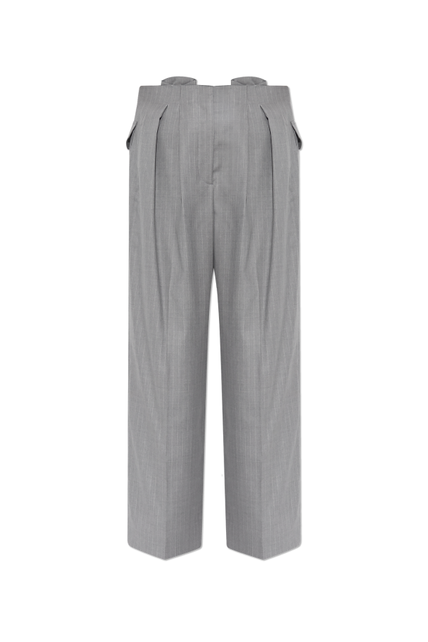 Grey ‘Voltera’ trousers from The Mannei. Made of virgin wool, this loose-fitting design features a hook, button and zip fastening, pinstripe pattern, decorative pleats, two front pockets, two flap pockets at the back and wide legs.